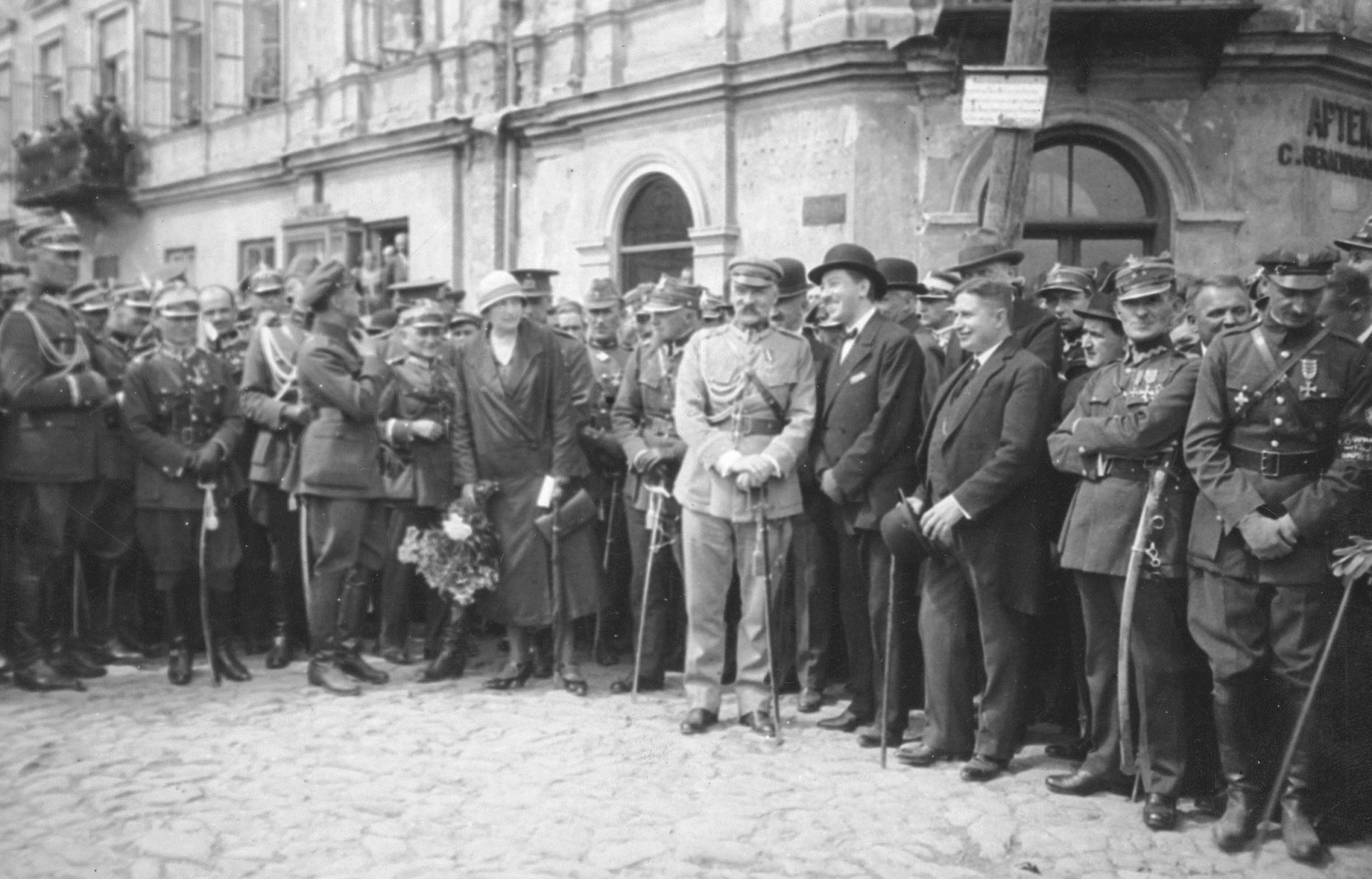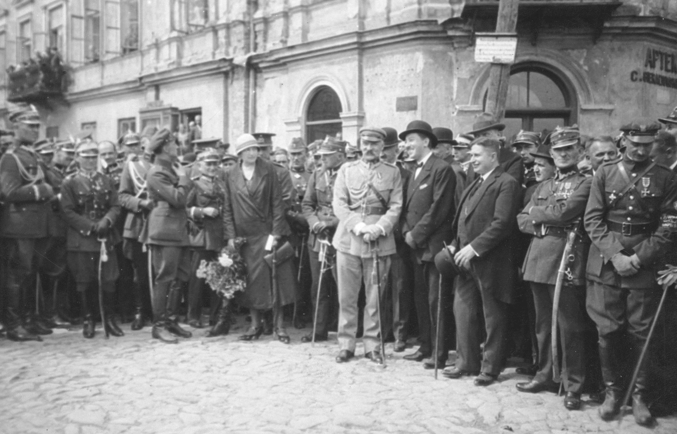 Marszałek Józef Piłsudski z legionistami na placu Wolności. Widoczni m.in.: gen. Gustaw Orlicz-Dreszer (1. z lewej), szef Gabinetu Wojskowego Prezydenta RP płk Sergiusz Zahorski (2. z lewej), minister Eugeniusz Kwiatkowski (1. na prawo od marszałka), Aleksandra Piłsudska (2. na lewo od marszałka), mjr Aleksander Prystor (1. na lewo od marszałka) oraz wojewoda kielecki Ignacy Manteuffel (za plecami Piłsudskiego, w meloniku).