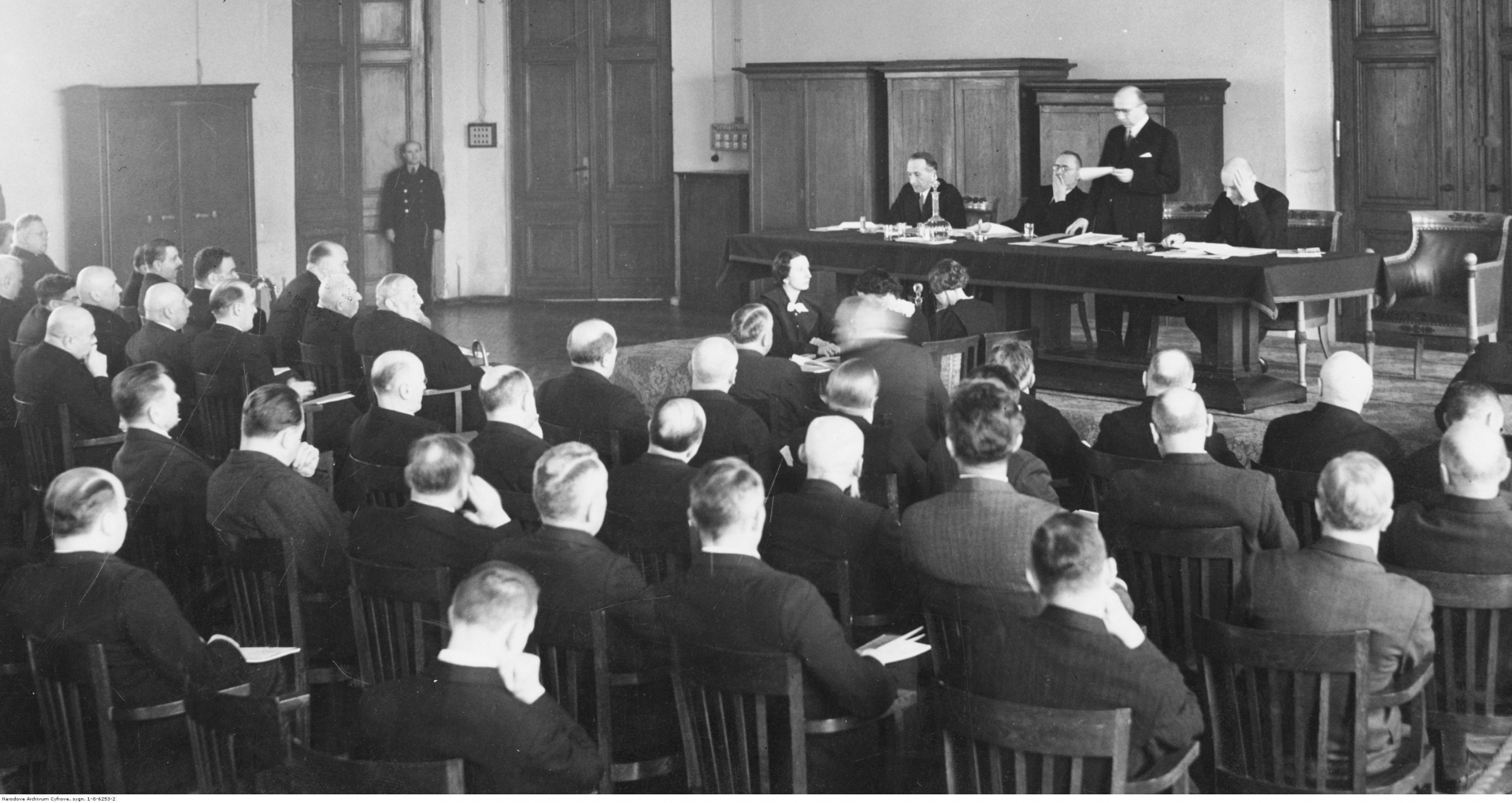 Walne zebranie akcjonariuszy Banku Polskiego w Warszawie w lutym 1936 r. share Podziel się facebook google + twitter linkedin clipboard envelope print quote picture add × Cytowane źródła Cytowanie źródła on-line, czyli Internetowego Polskiego Słownika Biograficznego Walne zebranie akcjonariuszy Banku Polskiego w Warszawie w lutym 1936 r., [online] Warszawa: Narodowy Instytut Audiowizualny [dostęp 27.02.2026]. Dostępny w internecie: http://www.biogramy.pl/a/foto/walne-zebranie-akcjonariuszy-banku-polskiego-w-warszawie-w-lutym-1936-r Cytowanie wydania drukowanego, czyli Polskiego Słownika Biograficznego , Walne zebranie akcjonariuszy Banku Polskiego w Warszawie w lutym 1936 r., [w:] Polski słownik biograficzny, t. , IPSBID: ipsb-fo-98009 × Wyślij link do strony E-mail odbiorcy wiadomości: To pole jest wymaganeWpisz poprawny adres e-mail Twój adres e-mail: To pole jest wymaganeWpisz poprawny adres e-mail Podgląd wiadomości, która zostanie wysłana: Witaj, [Tutaj podany Twój e-mail] poleca Ci treść z iPSB (internetowym Polskim Słowniku Biograficznym) Walne zebranie akcjonariuszy Banku Polskiego w Warszawie w lutym 1936 r. × Dodaj do kolekcji wybierz kolekcję, do której chcesz dodać ten artykuł: lub wpisz nazwę nowej kolekcji, do której chcesz dodać ten artykuł: : To pole jest wymagane Dodaj do kolekcji Wybierz kolekcję Swoje kolekcje znajdziesz w profilu. Wystarczy kliknąć ikonę zębatego koła w górnym prawym rogu. Możesz je zobaczyć tu: moje kolekcje. × Dodaj do kolekcji Element został dodany do Twojej kolekcji. Swoje kolekcje możesz zobaczyć tu: moje kolekcje. × Dodaj do kolekcji Aby dodawać materiały do kolekcji musisz się zalogować. OPIS POSTACI POWIąZANE W prezydium widoczni są (od lewej): dyrektor Departamentu Obrotu Pieniężnego Ministerstwa Skarbu Włodzimierz Baczyński, wiceprezes Banku Polskiego Jan Piłsudski, prezes Banku Polskiego Adam Koc, naczelny dyrektor Banku Polskiego Leon Barański. Postaci powiązane Jan Piłsudski 1876-01-15 - 1950-12-21 wicemarszałek Sejmu Leon Józef Barański 1895-03-18 - 1982-10-31 bankowiec Adam Ignacy Koc 1891-08-31 - 1969-02-03 polityk więcej >> Zobacz zdjęcie w najwyższej jakości Źródło