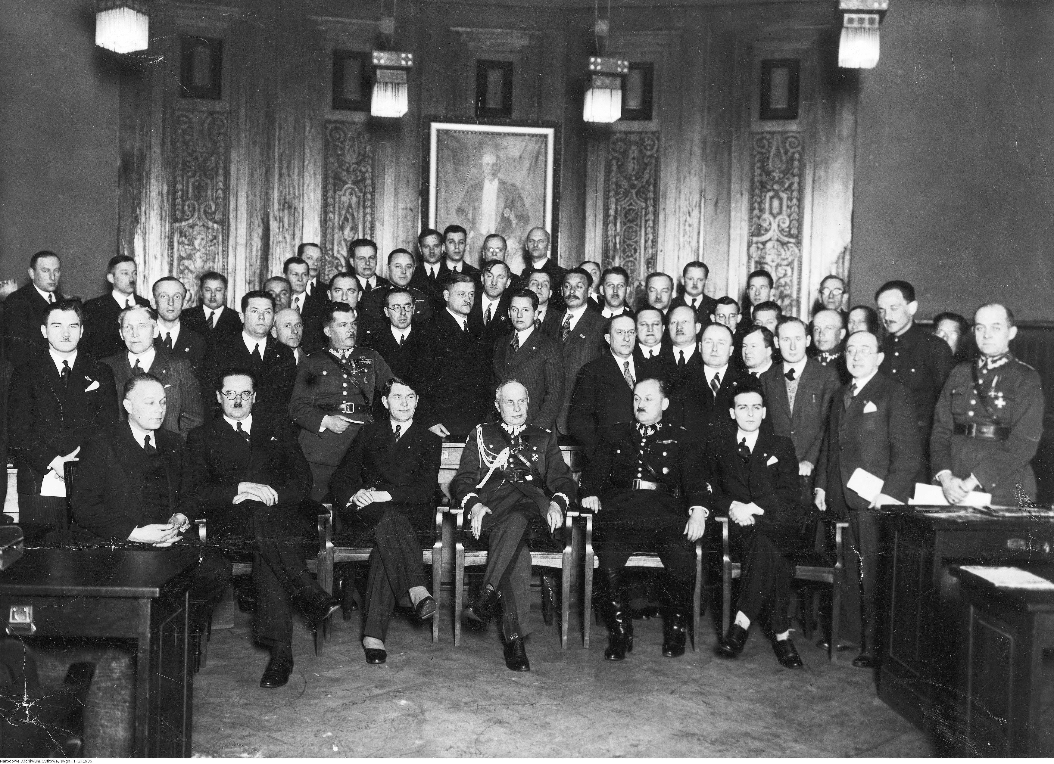 Wśród uczestników zebrania w pieszym rzędzie widoczni m.in.: wiceprezes klubu sportowego Polonia Warszawa Stanisław Frenkiel (1. z lewej), selekcjoner polskiej reprezentacji Tadeusz Kuchar, prezes Łódzkiego Związku Piłki Nożnej Heliodor Konopka, prezes Polskiego Związku Piłki Nożnej gen. Władysław Bończa-Uzdowski, przewodniczący zebrania i prezes Śląskiego Okręgowego Związku Piłki Nożnej inspektor Józef Żółtaszek oraz sekretarz walnego zebrania, dr Kwaśniewski. Stoją m.in.: Andrzej Przeworski (3 rząd, 1. z lewej), major Tadeusz Mirski-Woleński (na lewo za Heliodorem Konopką), dr Statter (za Heliodorem Konopką), major Zygmunt Żołędziowski (w środku pod portretem Prezydenta, 1. od góry), piłkarz Józef Kałuża (w środku pod portretem Prezydenta, 2. od góry), sekretarz generalny Polskiego Związku Piłki Nożnej inż. Michał Merliński (pod portretem prezydenta, 1. z lewej).