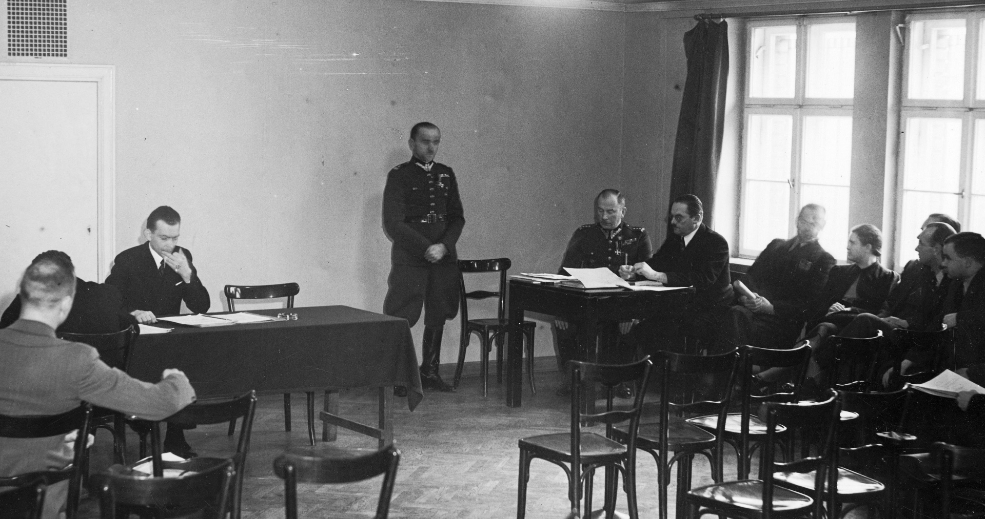 Przemawia delegat Państwowego Urzędu Wychowania Fizycznego i Przysposobienia Wojskowego major Kazimierz Kierzkowski. Widoczni m.in.: prezes Polskiego Związku Piłki Ręcznej pułkownik Adam Brzechwa-Ajdukiewicz (siedzi przy stoliku z prawej w mundurze), dyrektor Państwowego Urzędu Wychowania Fizycznego i Przysposobienia Wojskowego Tadeusz Kuchar (siedzi przy stoliku z prawej w okularach), przewodniczący zebrania Władysław Rzepka (siedzi przy stole z lewej).