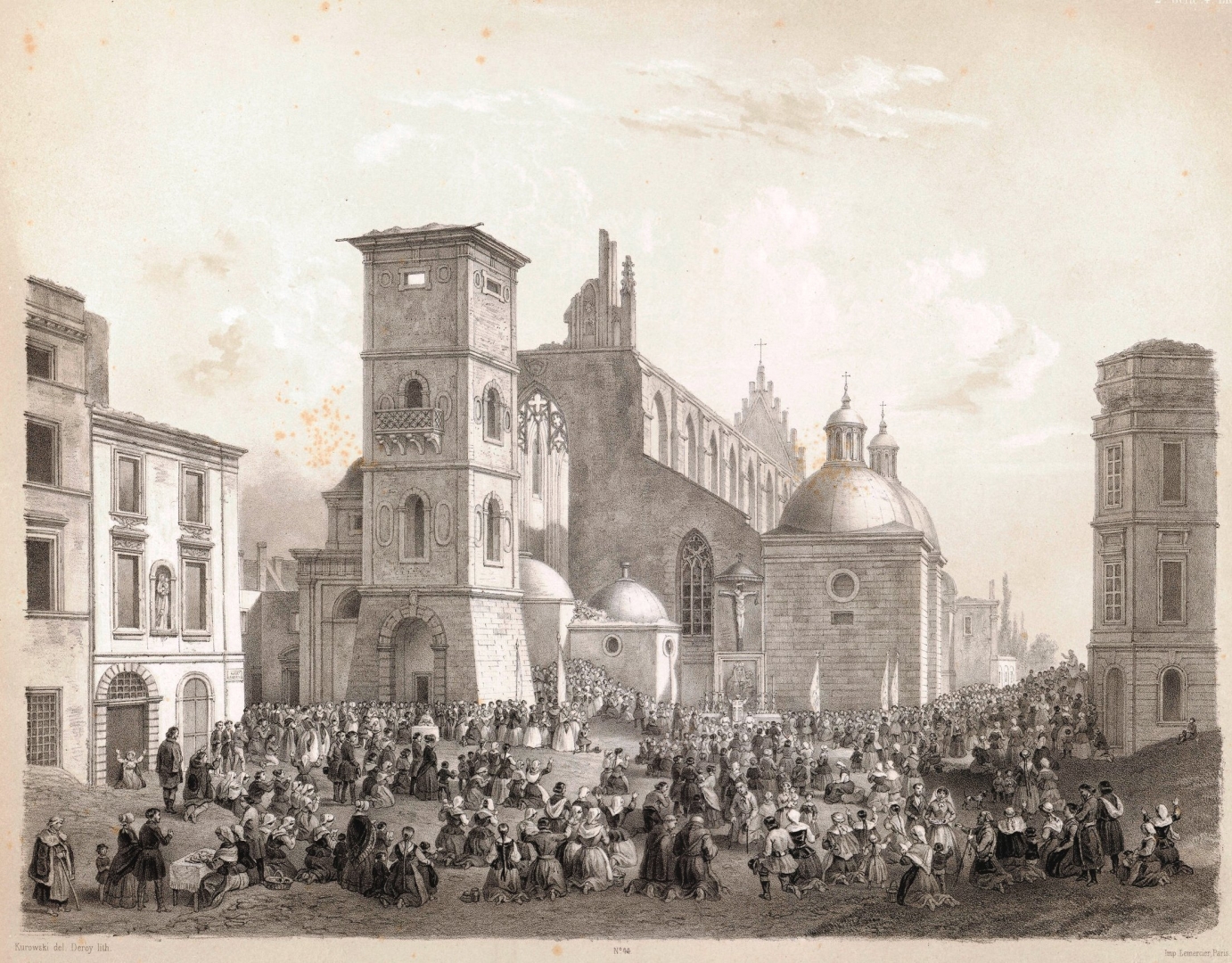 "Widok Krakowa po pożarze w 1850 r., przedstawiający nabożeństwo przy rozpoczęciu odbudowy kościoła dominikanów", [online] Warszawa: Narodowy Instytut Audiowizualny [dostęp 27.02.2026]. Dostępny w internecie: http://www.biogramy.pl/a/foto/widok-krakowa-po-pozarze-w-1850-r-przedstawiajacy-nabozenstwo-przy-rozpoczeciu-odbudowy-kosciola-dominikanow