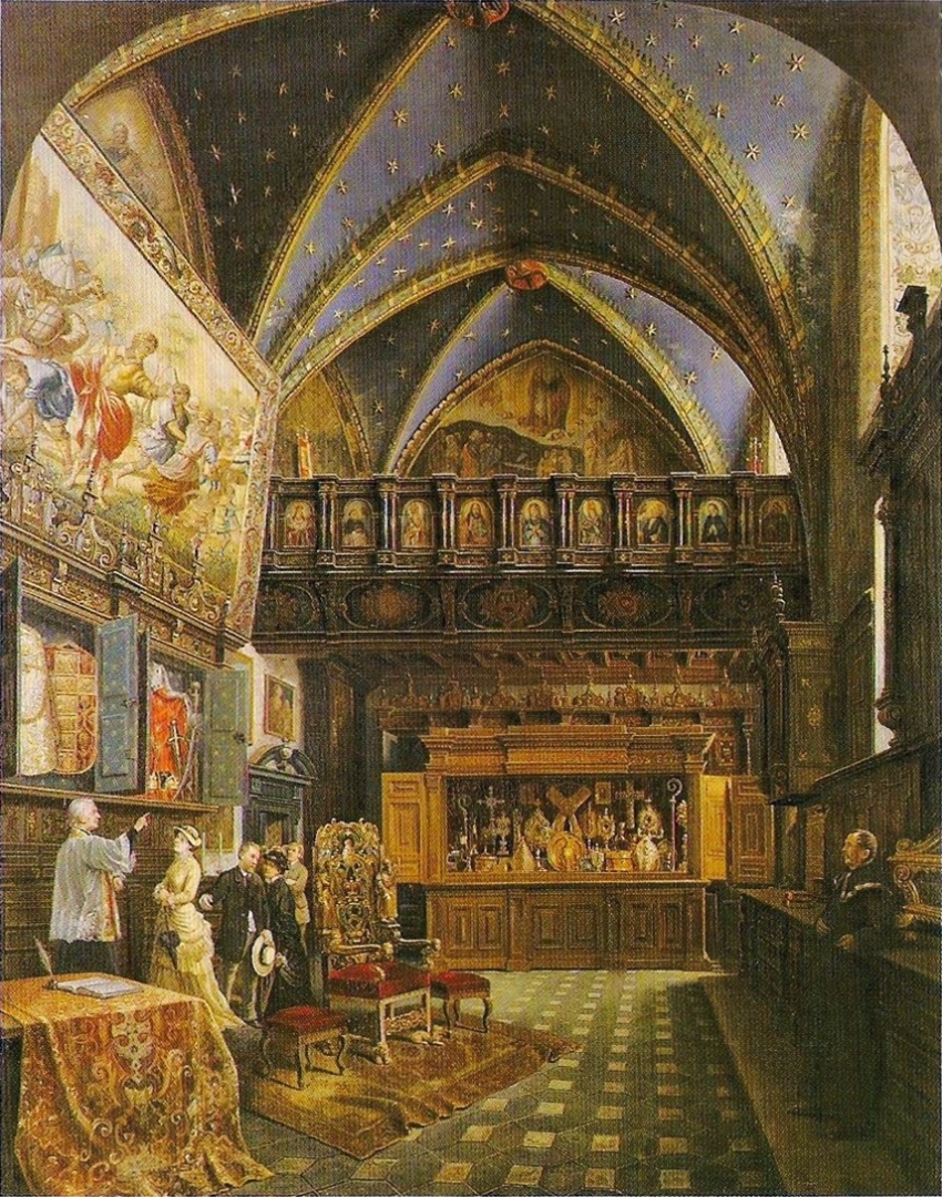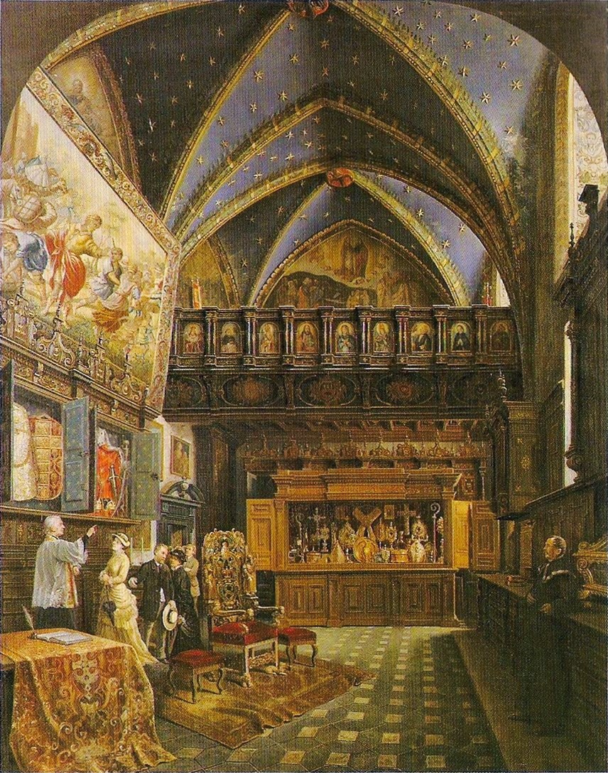 "Widok wnętrza skarbca katedry krakowskiej" Saturnina Świerzyńskiego., [online] Warszawa: Narodowy Instytut Audiowizualny [dostęp 06.03.2026]. Dostępny w internecie: http://www.biogramy.pl/a/foto/widok-wnetrza-skarbca-katedry-krakowskiej-saturnina-swierzynskiego