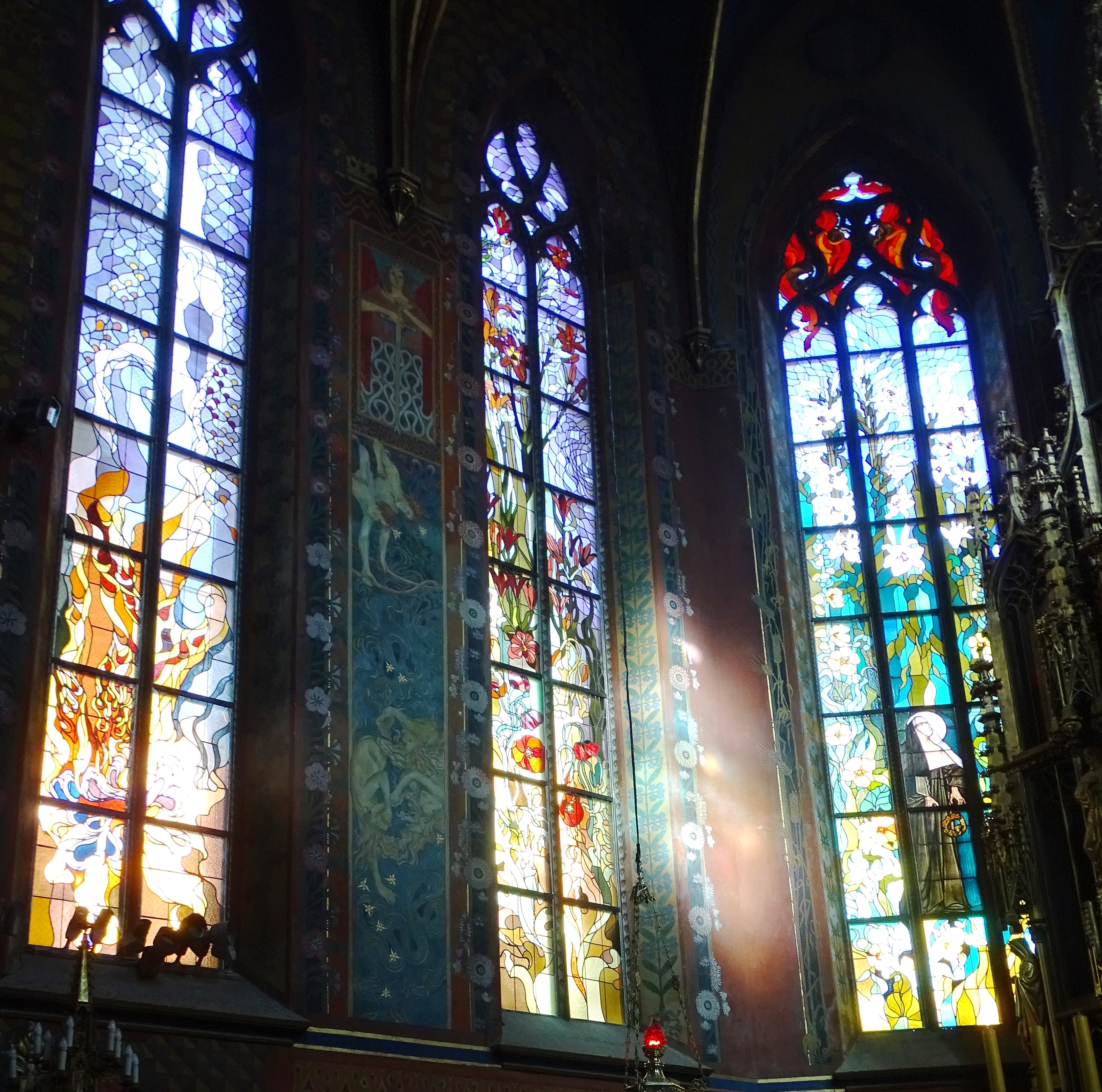 Dwa witraże z lewej strony przedstawiają potęgę żywiołu Ognia. Między nimi znajduje się polichromia „Strącenie zbuntowanych aniołów". Na trzecim witrażu artysta umieścił błogosławioną Salomeę wśród białych lilii. Zlecenie na projekty tych witraży Wyspiański dostał w 1897 r. Szkła wykonane w Innsbrucku osadzono w oknach prezbiterium w 1899 roku.