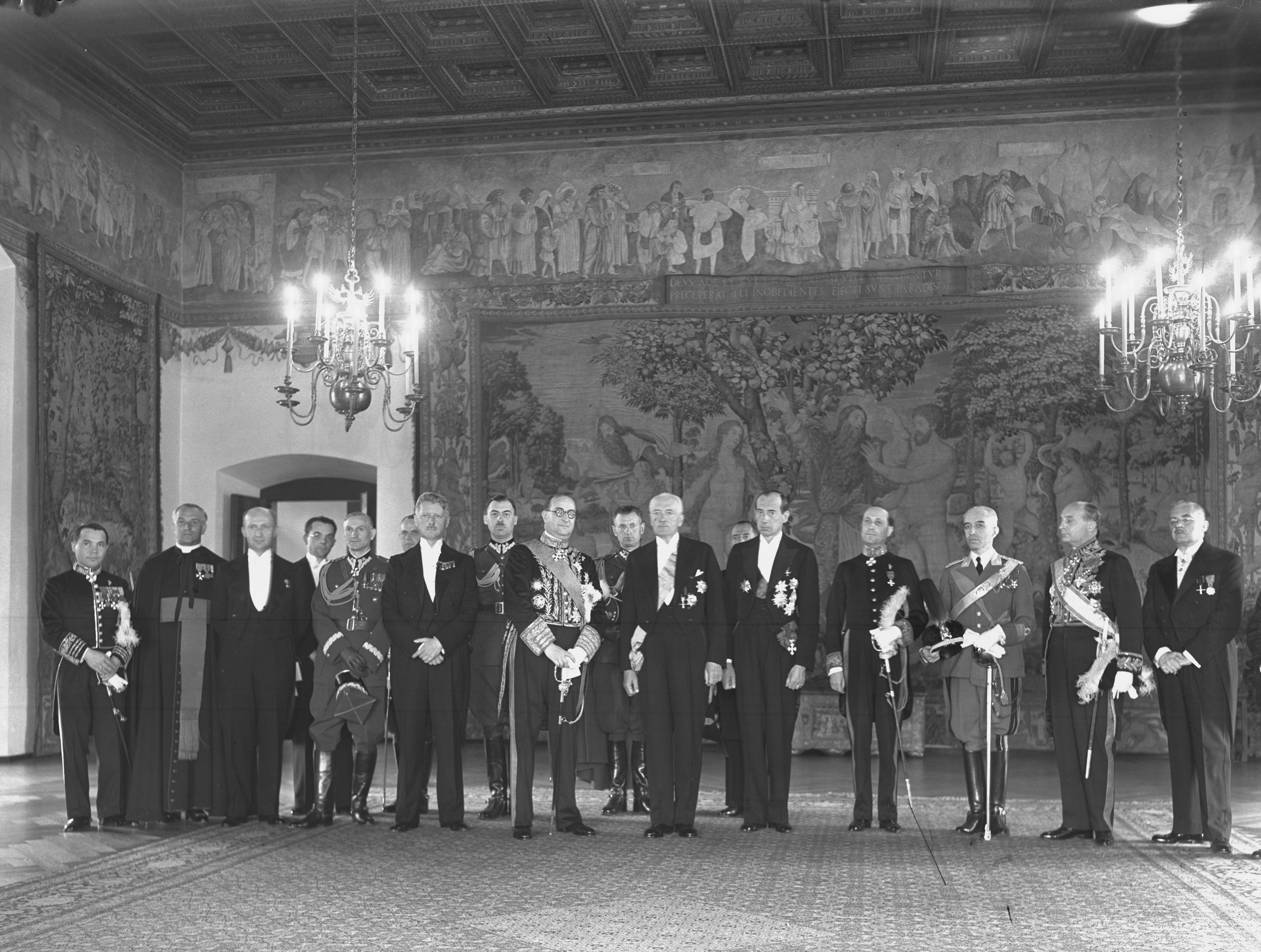 Ambasador Włoch w Polsce Pietro Arone di Valentino w towarzystwie: prezydenta RP Ignacego Mościckiego (szósty z lewej w pierwszym rzędzie), ks. prałata Jana Humpoli, szefa Kancelarii Wojskowej Prezydenta RP Stanisława Łepkowskiego (trzeci z lewej w pierwszym rzędzie), wojewody Krakowskiego Michała Gnoińskiego (piąty z lewej w pierwszym rzędzie), ministra spraw zagranicznych Józefa Becka (piąty z prawej w pierwszym rzędzie), szefa Protokołu Dyplomatycznego MSZ Karola Romera (drugi z lewej w pierwszym rzędzie), szefa Gabinetu Wojskowego Prezydenta RP gen. Kazimierza Schally (trzeci z lewej w drugim rzędzie) i kpt. Józefa Hartmana (czwarty z lewej w drugim rzędzie) po złożeniu listów.