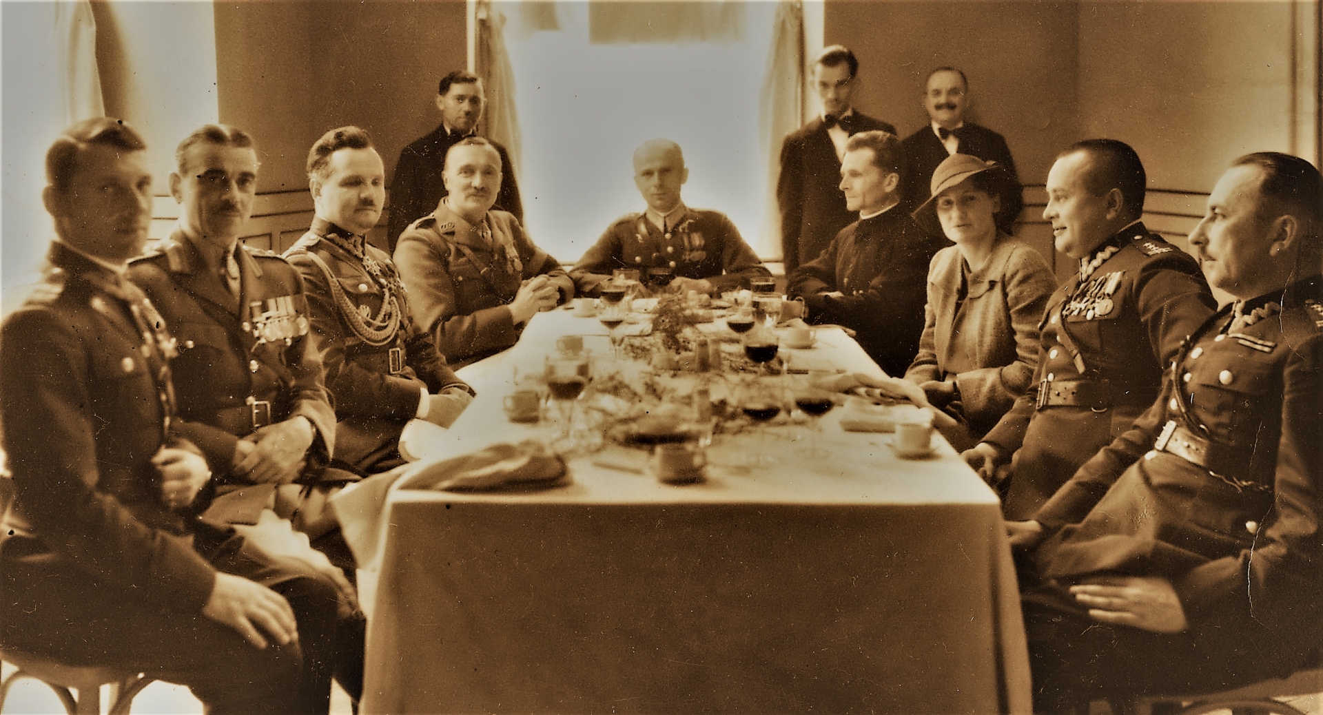 Wśród uczestników obiadu widoczni m.in.: angielski płk Hastings Lionel Ismay (2 z lewej), angielski attache wojskowy płk Connal Rowan (4 z lewej), ks. Tadeusz Kruszyński (4 z prawej), płk Marian Bolesławicz (3 z lewej), płk Józef Ćwiertniak (2 z prawej).