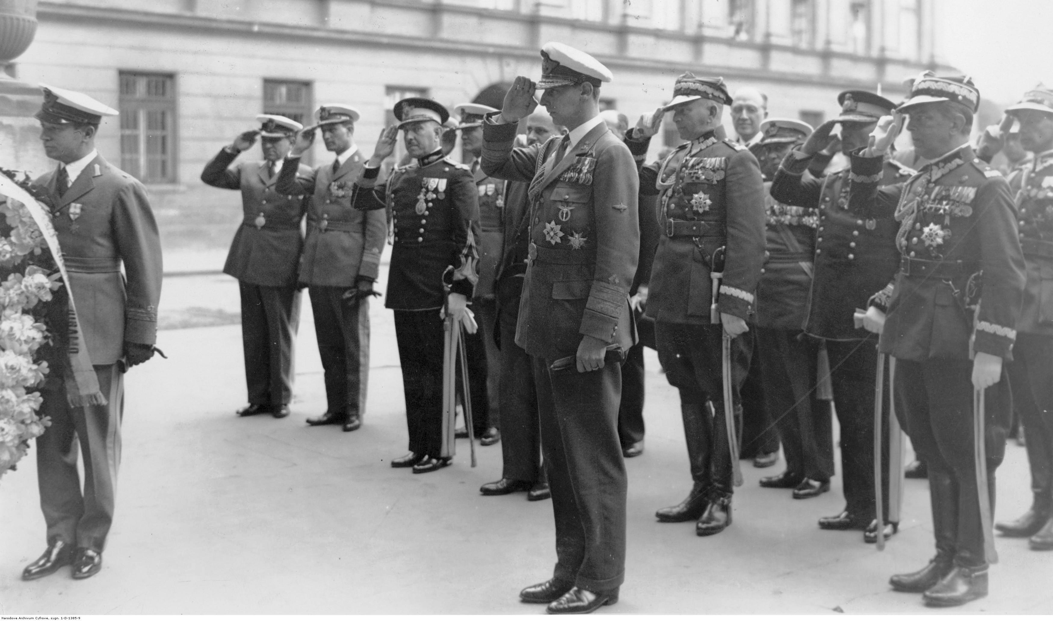 Książę Mikołaj (przed szeregiem) w asyście wojskowych salutuje przed Grobem Nieznanego Żołnierza, na którym złożył wieniec. Towarzyszą mu m.in.: gen. Janusz Gąsiorowski (pierwszy z prawej w pierwszym rzędzie), gen. Tadeusz Fabrycy (drugi z prawej w pierwszym rzędzie) oraz zastępca szefa Protokołu Dyplomatycznego MSZ Rajnold Przeździecki (na prawo za gen. Fabrycym).