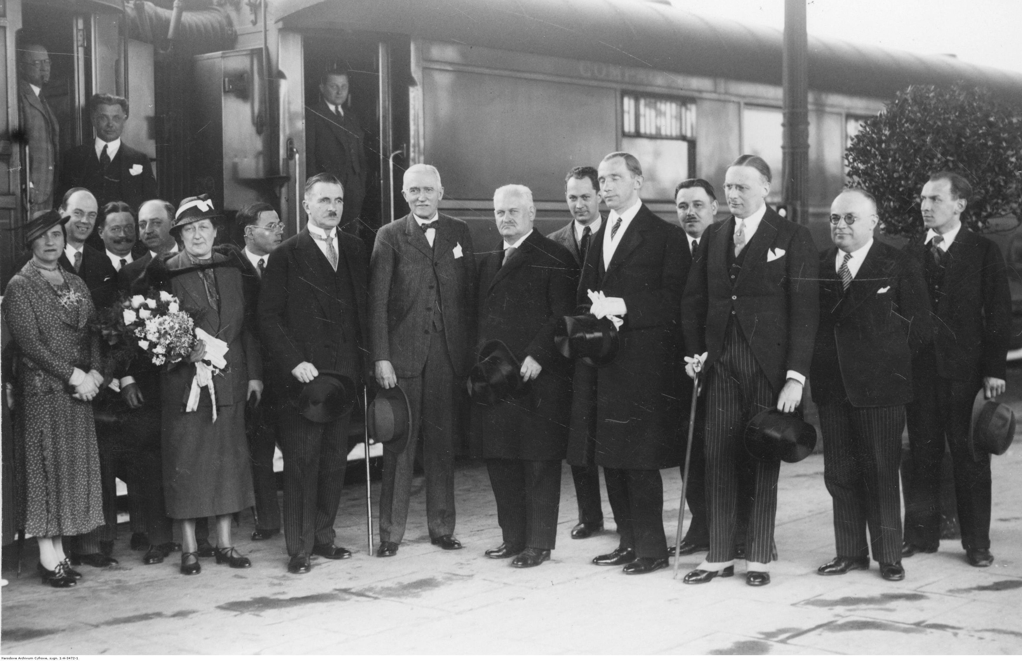 Powitanie delegacji radnych Paryża na dworcu kolejowym w Poznaniu. Widoczni m.in. prezes Rady Miejskiej Paryża Lamourex de Fontenay, prezydent Poznania Cyryl Ratajski, konsul francuski Jean Jacques Serre, wiceprezes Rady Miejskiej Paryża Boulard, sekretarz Rady Miejskiej Paryża Levee, starosta grodzki poznański Marian Podhorodeński, prezes Rady Miejskiej Poznania profesor Romuald Paczkowski, dyrektor Międzynarodowych Targów Poznańskich profesor Stefan Ropp.
