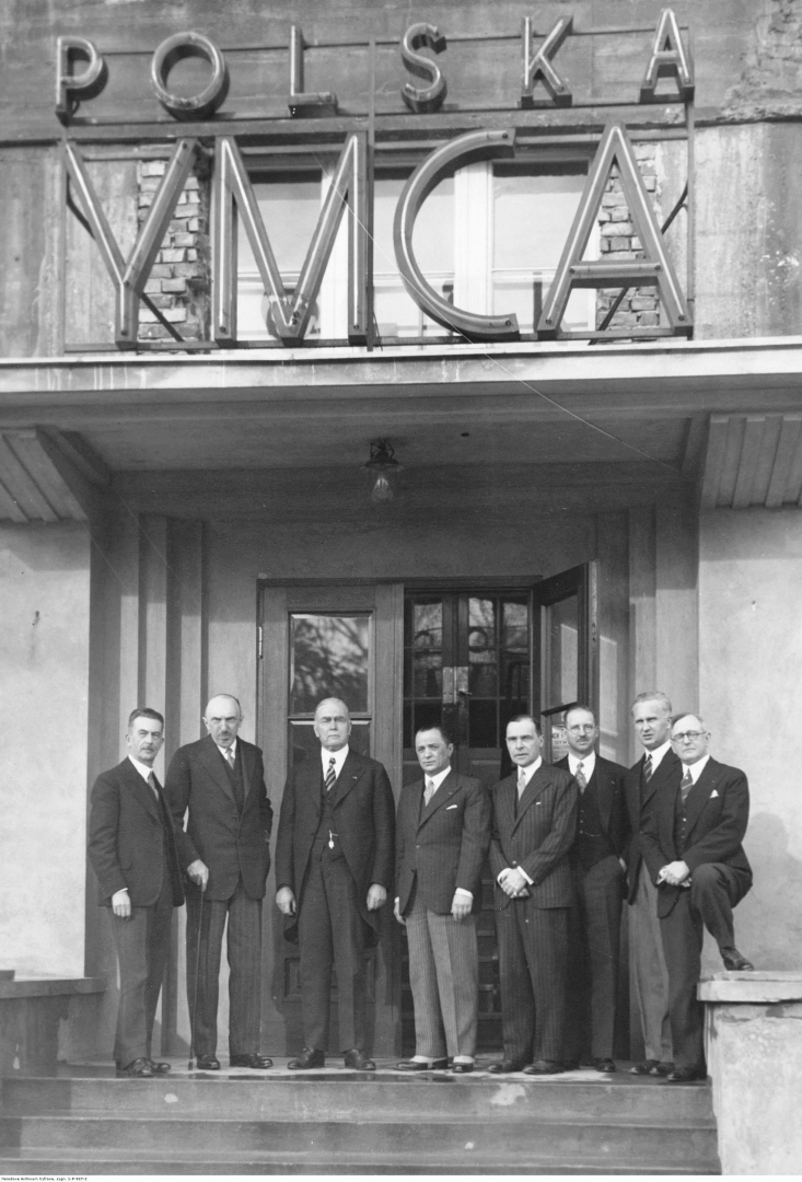 Amerykański działacz J. R. Mott (trzeci z lewej) w towarzystwie (od lewej): inż. M. Ponikowskiego, byłego ministra Seweryna Ludkiewicza, rzeźbiarza Edwarda Wittiga, architekta. A. Jawornickiego, dyrektora generalnego "Polskiej YMCA" E. R. Cummingsa, radcy MSZ Wiktora Podoskiego i dyrektora ogniska krakowskiego "Polskiej YMCA" Paula Supera przed gmachem Związku Młodzieży Chrześcijańskiej "Polska YMCA".