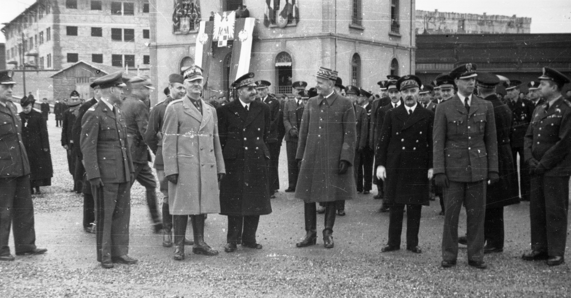 Przygotowanie do defilady. Na pierwszym planie od lewej: NN, gen. Józef Zając, gen, Władysław Sikorski, gen. V. Denain, NN, NN, NN, ppłk. Mateusz Iżycki. Za gen. Sikorskim płk. dypl. Aleksander Kędzior. Widoczny także m.in. płk. Stefan Pawlikowski. Fotografia Czesława Datki.