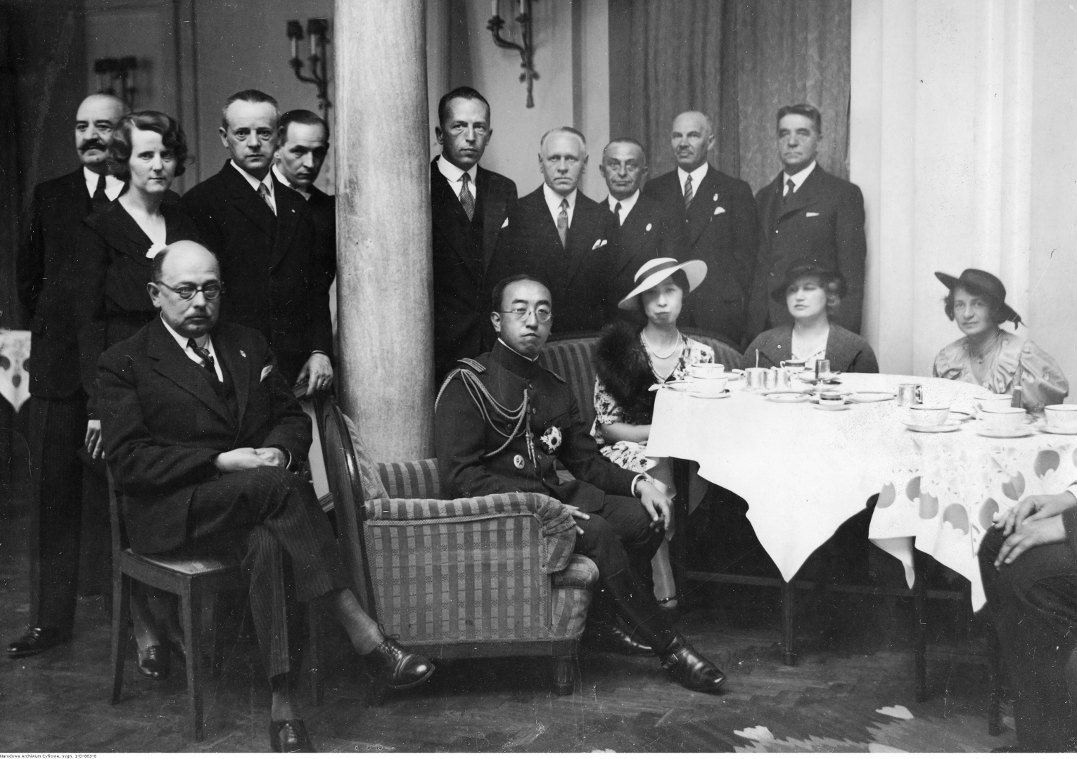 Przyjęcie na cześć japońskiego księcia Tsunenori Kaya i jego małżonki w Hotelu Europejskim. Od lewej siedzą: prezes Towarzystwa Polsko-Japońskiego Józef Targowski, książę Tsunenori Kaya i księżniczka Toshiko Kaya, Helena Bobkowska (1. z prawej w jasnej sukience). Na drugim planie widoczni m.in.: kierownik Referatu Ogólnego MSZ Aleksander Łubieński i kierownik Referatu Ogólnego Kancelarii Cywilnej Prezydenta RP Henryk Zaniewski.