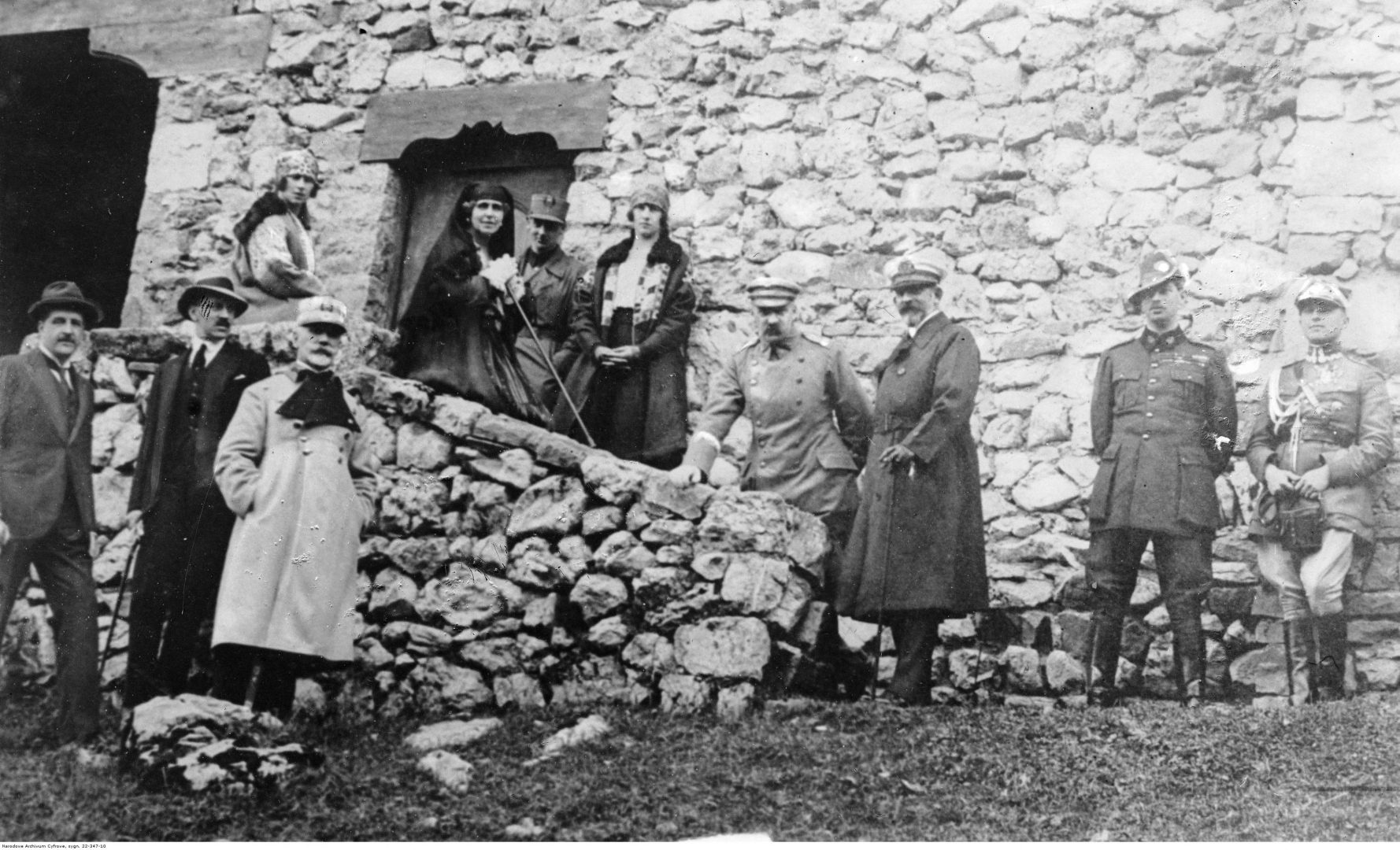 Naczelnik Państwa Józef Piłsudski z rodziną królewską. Widoczni m.in. król Ferdynand I (3. z prawej), książę Karol (2. z prawej) Królowa Maria Koburg (na schodach, 2. z lewej), książę Mikołaj (na schodach, 3. z lewej), księżniczki Maria i Elżbieta oraz Aleksander Skrzyński (2. z lewej).
