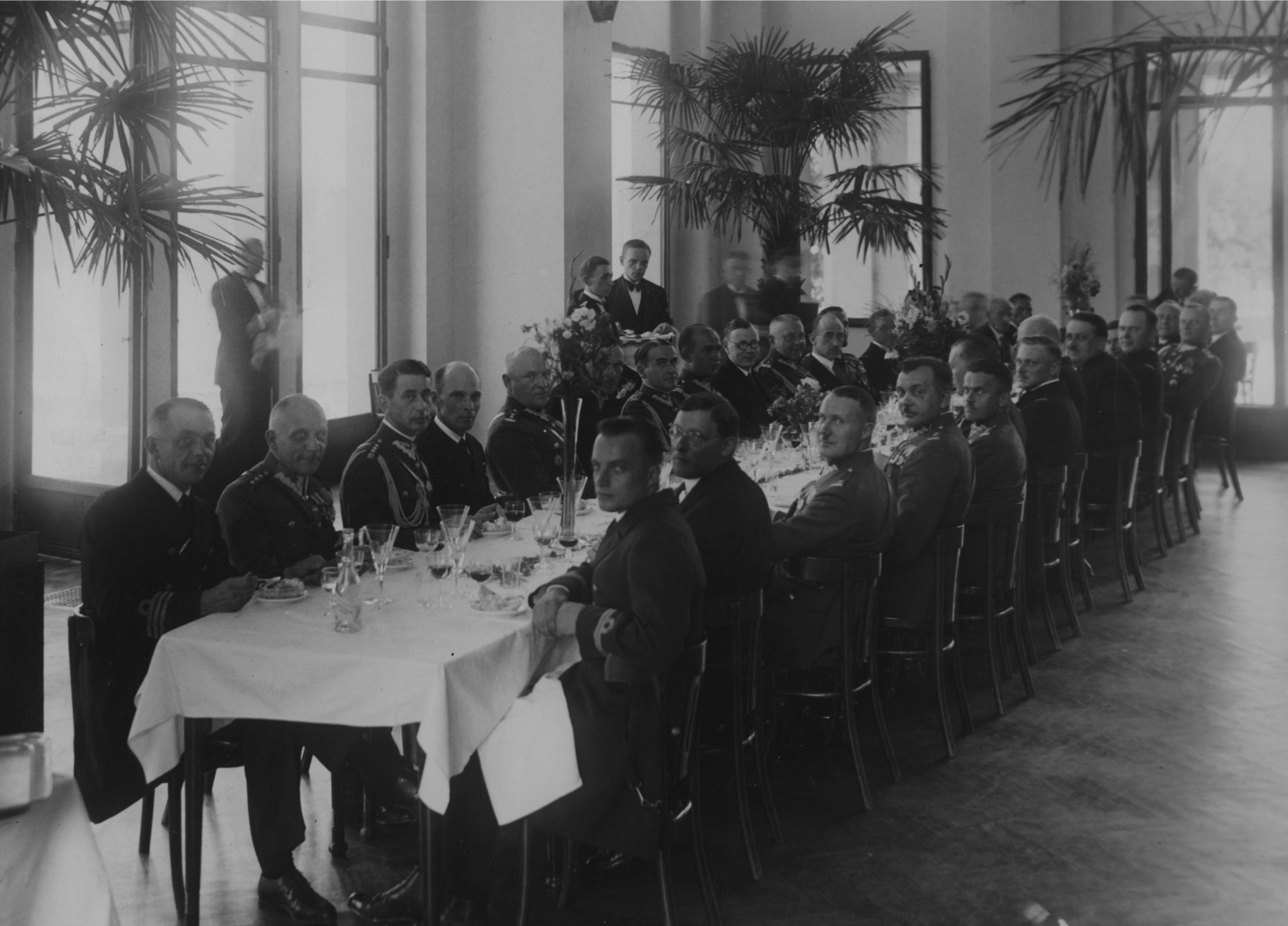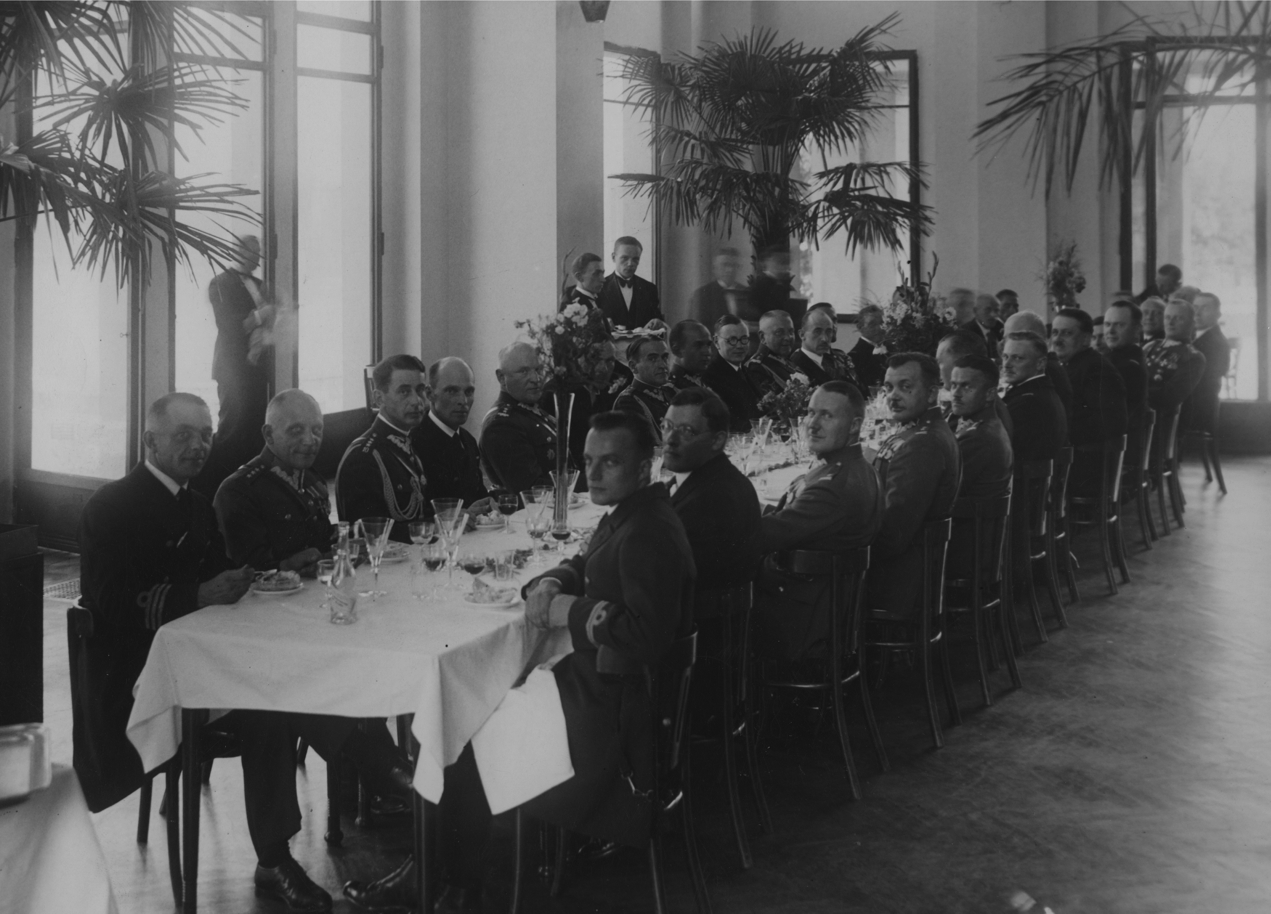 Uczestnicy obiadu w Yacht Clubie Oficerskim przy stole. Widoczni m.in. w lewym rzędzie: gen. Tadeusz Kasprzycki (8 z lewej), gen. Kazimierz Fabrycy (10 z lewej), łotewski charges d`affair Stegemans (9 z lewej), minister Tadeusz Schaetzel (11 z lewej). W prawym rzędzie widoczni m.in. wiceminister Jan Szembek (9 z lewej), ppłk Adam Sokołowski (2 z prawej, wychyla się).