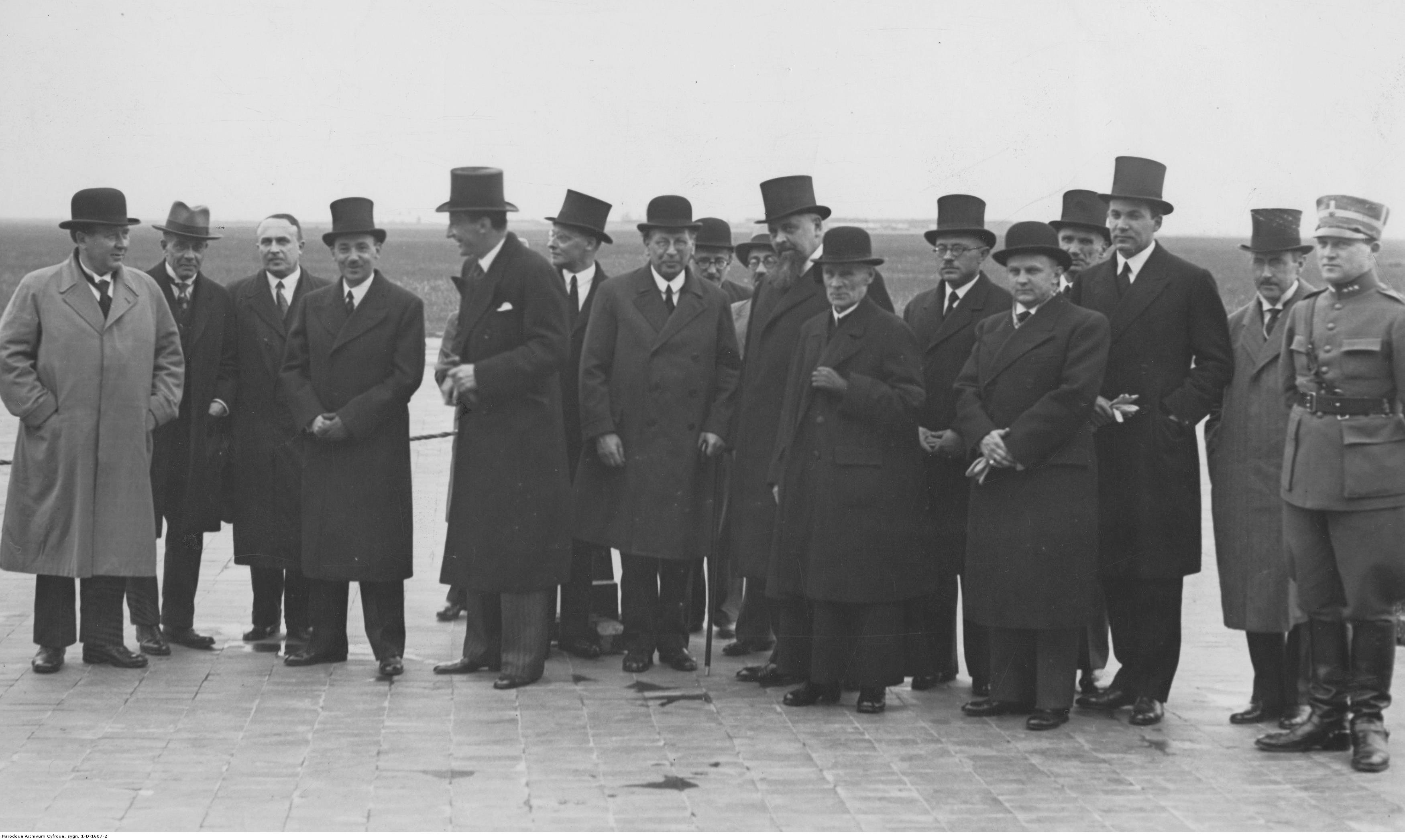 Powitanie ministra oświaty i wyznań Szwecji Artura Engberga (1. z lewej) na lotnisku Okęcie w Warszawie. Widoczny poseł nadzwyczajny i minister pełnomocny Szwecji w Polsce Erik Boheman (5. zlewej), minister wyznań religijnych Janusz Jędrzejewicz (4. z lewej), wiceminister Konstanty Chyliński (10. z lewej), wiceminister ksiądz Bronisław Żongołłowicz (11. z lewej)