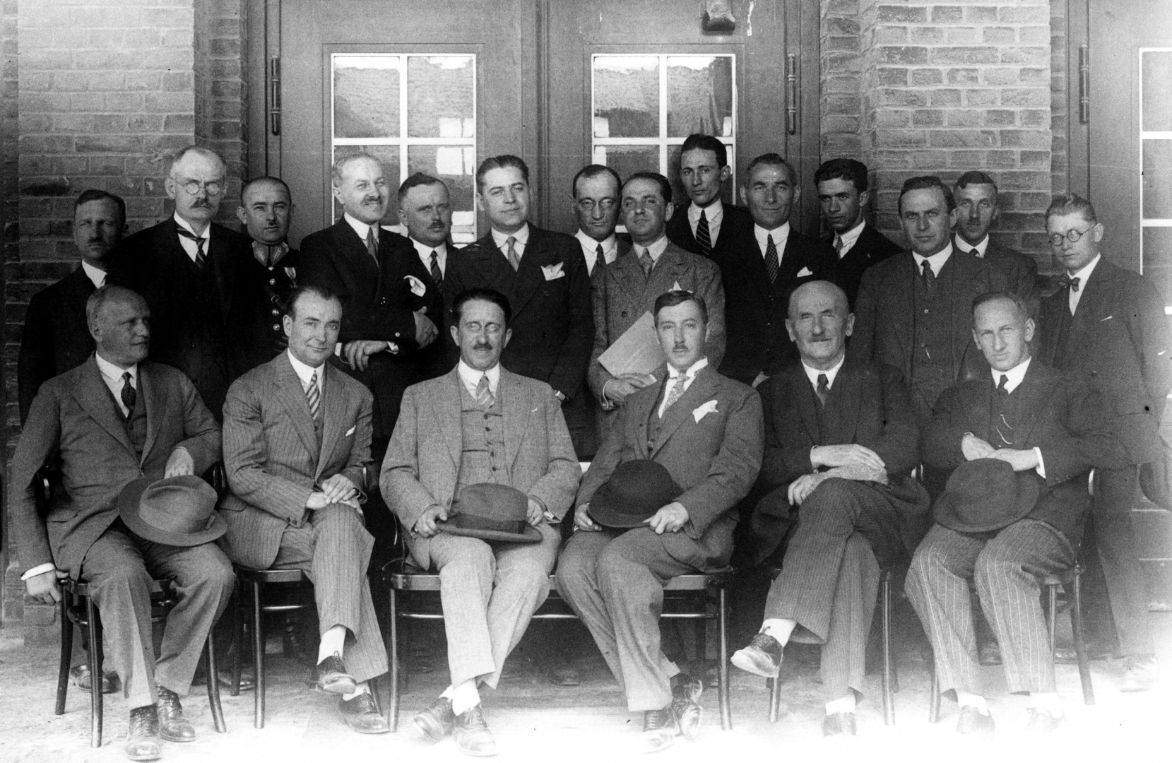 Minister przemysłu i handlu Rumunii Virgil Madgearu (trzeci z lewej w pierwszym rzędzie) oraz minister przemysłu i handlu RP Eugeniusz Kwiatkowski (czwarty z lewej w pierwszym rzędzie) w otoczeniu towarzyszących im w podróży osób, przedstawicieli województwa śląskiego i dyrekcji zakładów przemysłowych w Chorzowie. Widoczny m.in.: dyrektor Departamentu Handlowego Ministerstwa Przemysłu i Handlu Mieczysław Sokołowski (pierwszy z lewej w pierwszym rzędzie), dyrektor Departamentu Ministerstwa Przemysłu i Handlu Rumunii Cesar Popescu (trzeci z lewej w drugim rzędzie) oraz charge d'affaires Poselstwa Rumunii w Polsce George Davidescu (drugi z lewej w pierwszym rzędzie).