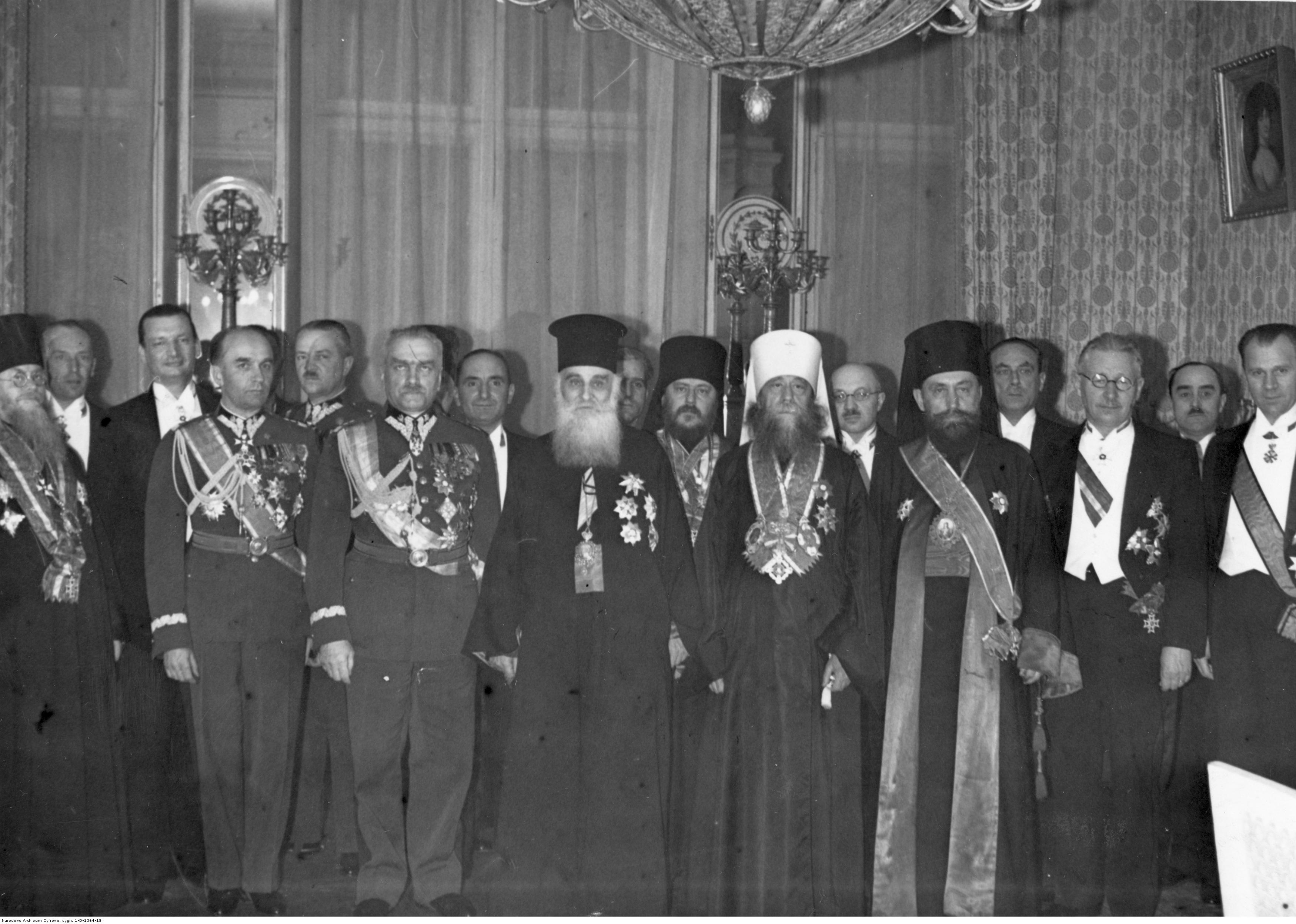 Fotografia grupowa uczestników przyjęcia wydanego w Poselstwie Rumunii. Widoczni: szef Protokołu Dyplomatycznego MSZ Aleksander Łubieński (drugi z lewej), ambasador Polski w Rumunii hr. Roger Raczyński (trzeci z lewej), minister spraw wojskowych RP gen. Tadeusz Kasprzycki (czwarty z lewej), wiceminister spraw wojskowych gen. Janusz Głuchowski (piąty z lewej), premier RP gen. Felicjan Sławoj Składkowski (szósty z lewej), premier Rumunii patriarcha Miron Cristea (ósmy z lewej), metropolita prawosławny Dionizy Waledyński (siódmy z prawej), metropolita prawosławny Bukowiny Visarion Puiu (piąty z prawej), minister wyznań religijnych i oświecenia publicznego Wojciech Świętosławski (trzeci z prawej).