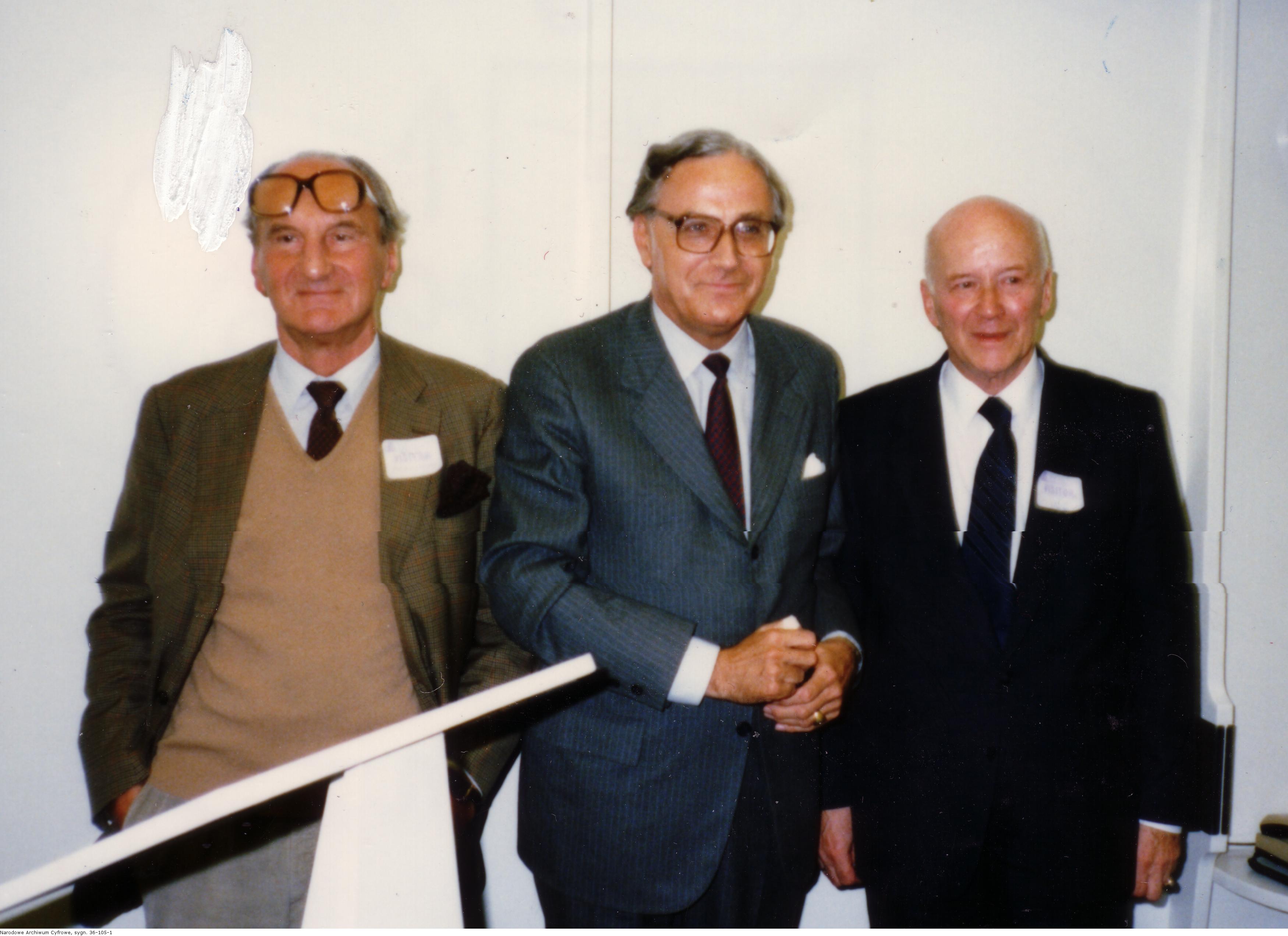 Stoją od lewej: Zygmunt Michałowski, Marek Łatyński, Jan Nowak -Jeziorański.