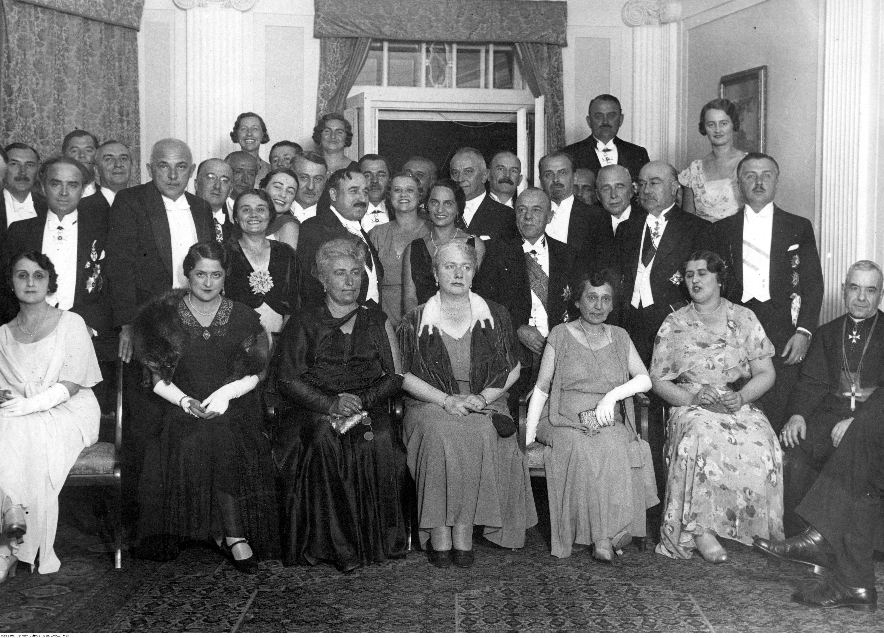 Raut w salonach Poselstwa RP w Belgradzie. Widoczni m.in. poseł nadzwyczajny i minister pełnomocny Polski w Jugosławii Władysław Schwarzburg-Gunter, wicemarszałek senatu Antoni Bogucki, wicemarszałek sejmu Wacław Makowski, prezes Senatu w Jugosławii Ante Pawelic, premier Jugosławii Milan Srskic, minister spraw zagranicznych Jugosławii Gottlieb Jevtic, poseł Tadeusz Dyboski, prezydent Skupsztyny Kosta Kumanudi, nuncjusz papieski w Jugosławii Ermengildo Pelegrinetti.