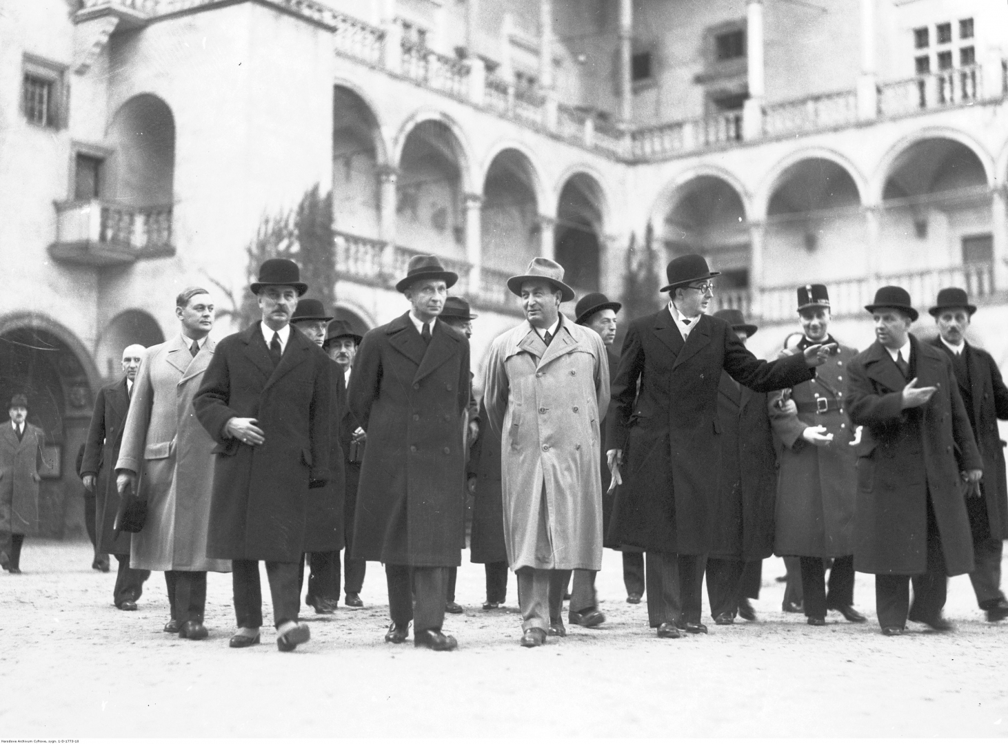 Premier Gyula Gombos (w środku, w jasnym palcie). Widoczni również m.in.: wicewojewoda krakowski Piotr Małaszyński (2 z prawej) i kierownik Referatu Ogólnego MSZ Aleksander Łubieński (między Gombosem a Przypkowskim), kierownik Biura Propagandy Krakowa Tadeusz Przypkowski (4 z prawej).