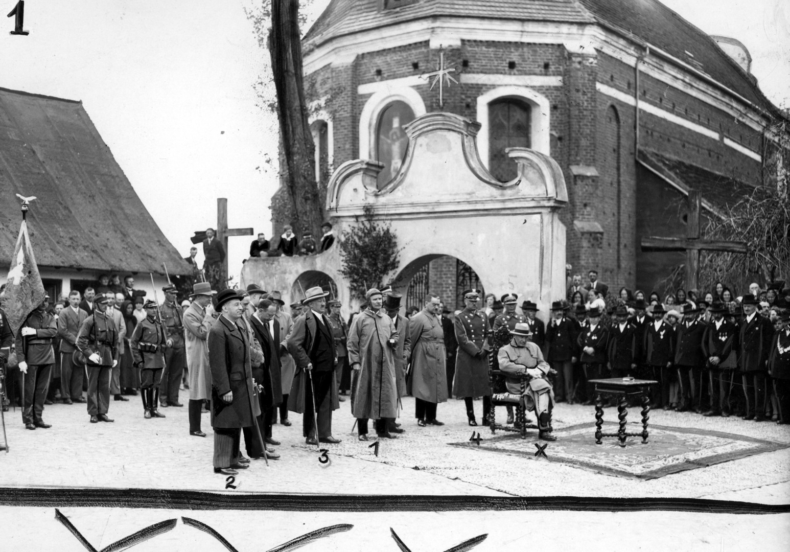 Wizyta prezydenta RP Ignacego Mościckiego w Wielkopolsce (25 maja 1929 r.). Powitanie prezydenta RP Ignacego Mościckiego (x) przed kościołem. Widoczni m.in. minister rolnictwa i dóbr państwowych Karol Niezabytowski (1), szef Gabinetu Wojskowego prezydenta RP pułkownik Jan Głogowski (4), działacz spółdzielczy Włodzimierz Seydlitz (2), prezes Wielkopolskiego Towarzystwa Kółek Rolniczych Leon Pluciński (3), adiutant prezydenta RP Ignacego Mościckiego rotmistrz Wacław Calewski.