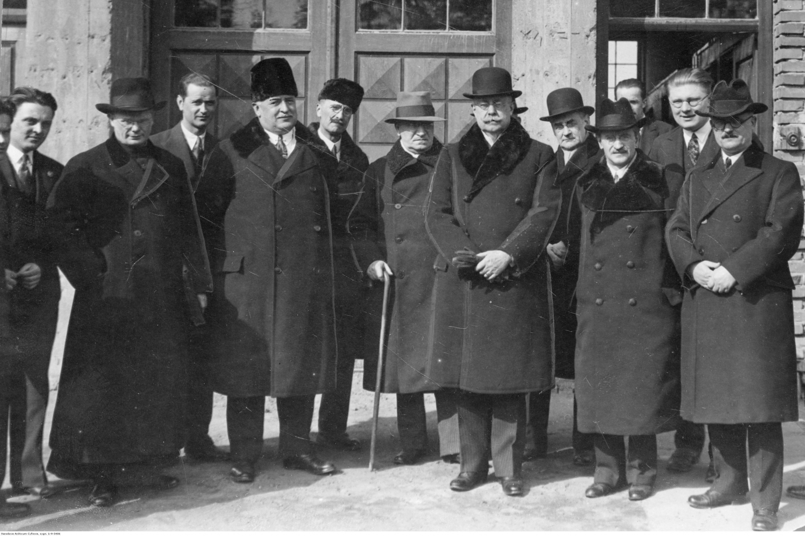 Profesorowie wyższych uczelni przed domem akademickim. Widoczny m.in. rektor Uniwersytetu Jagiellońskiego ks. prof. Kazimierz Michalski, rektor Uniwersytetu Warszawskiego prof. Jan Łukasiewicz (I rząd 2. z prawej), rektor Uniwersytetu Stefana Batorego w Wilnie prof. Aleksandr Januszkiewicz (7. z lewej).