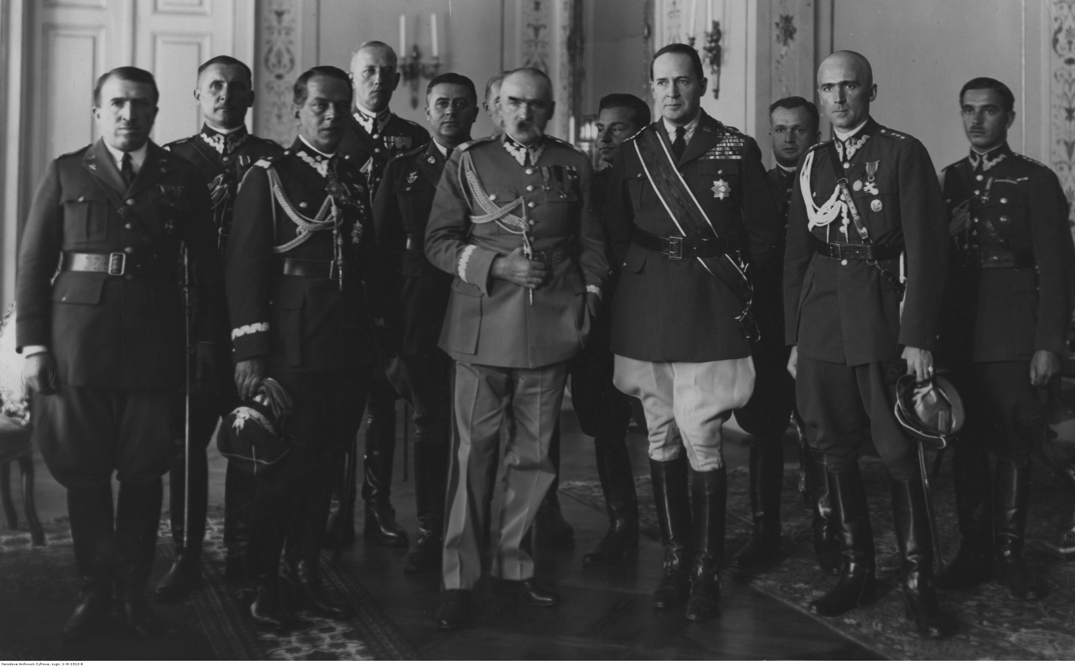 Gen. Douglas MacArthur z wizytą u marszałka Józefa Piłsudskiego w Belwederze. Widoczni od lewej: mjr William Colbern, NN, gen. Janusz Gąsiorowski, NN, adiutant kpt. George Davies, charge d'affairs Sheldon L. Crosby, marszałek Józef Piłsudski, kpt. Mieczysław Lepecki, gen. Douglas MacArthur.
