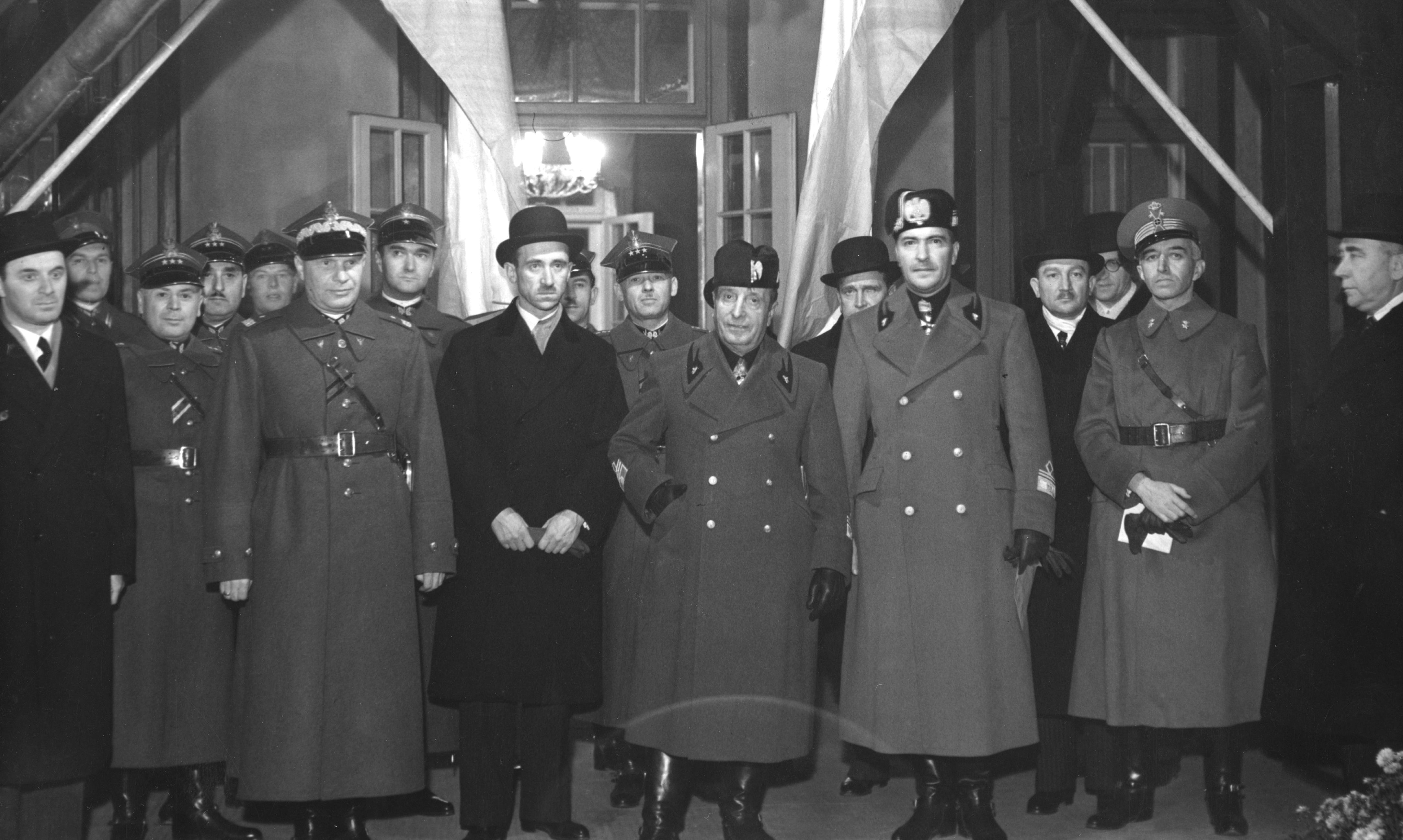 Pożegnanie oficerów włoskich na Dworcu Głównym w Warszawie. Widoczni m.in.: gen. Vittorio Raffaldi (3. z prawej w pierwszym rzędzie), gen. Ragioni (4. z prawej w pierwszym rzędzie), wicemarszałek sejmu Tadeusz Schaetzel (5. z prawej w pierwszym rzędzie), gen. Władysław Bończa-Uzdowski (3. z lewej w pierwszym rzędzie).