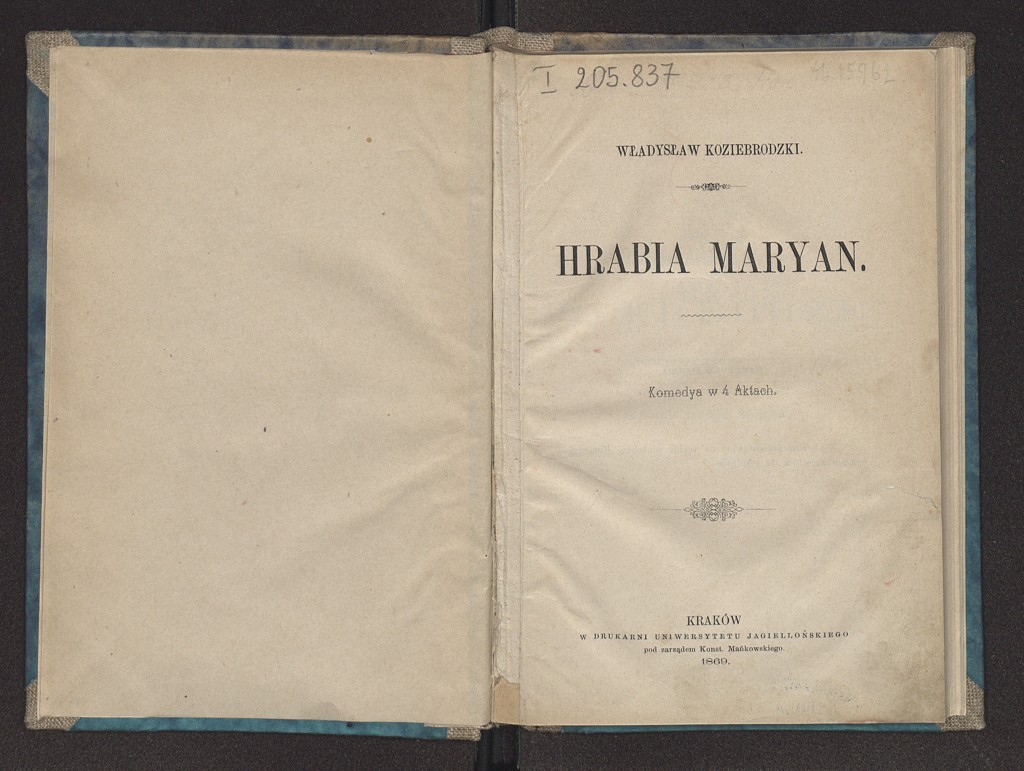Władysław Koziebrodzki, "Hrabia Maryan. Komedya w 4 Aktach", Kraków 1869 (strona tytułowa)., [online] Warszawa: Narodowy Instytut Audiowizualny [dostęp 15.04.2026]. Dostępny w internecie: http://www.biogramy.pl/a/foto/wladyslaw-koziebrodzki-hrabia-maryan-komedya-w-4-aktach-krakow-1869-strona-tytulowa