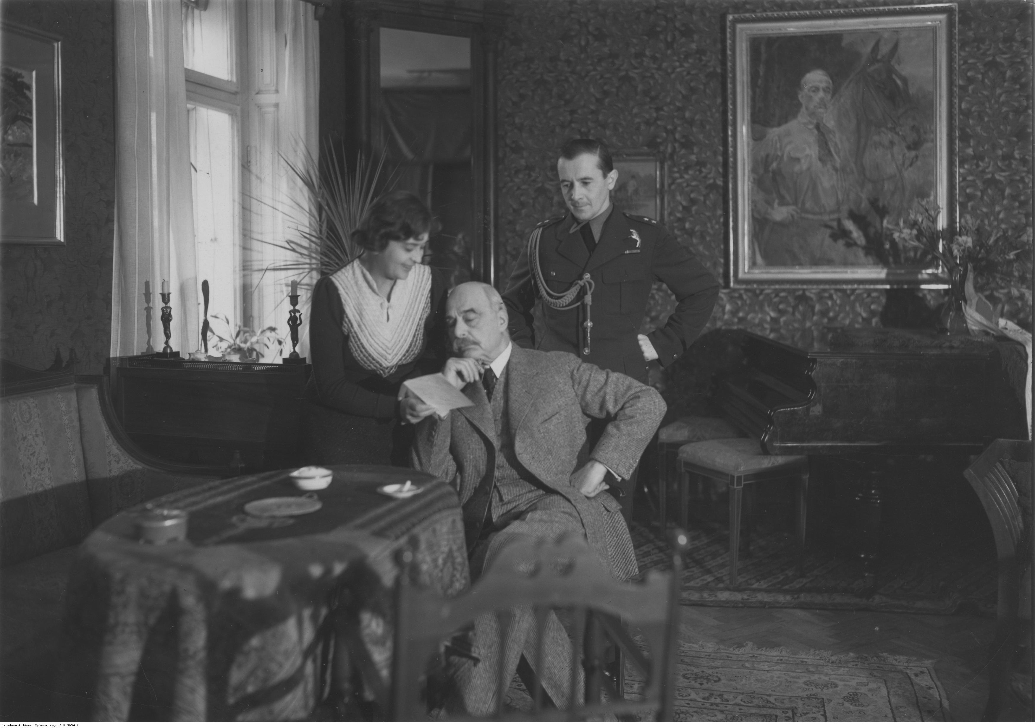 , Wojciech Kossak z córką Magdaleną Samozwaniec i z mężem drugiej córki Marii Stefanem Jerzym Jasnorzewskim, w salonie swojej willi., [w:] Polski słownik biograficzny, t. ,