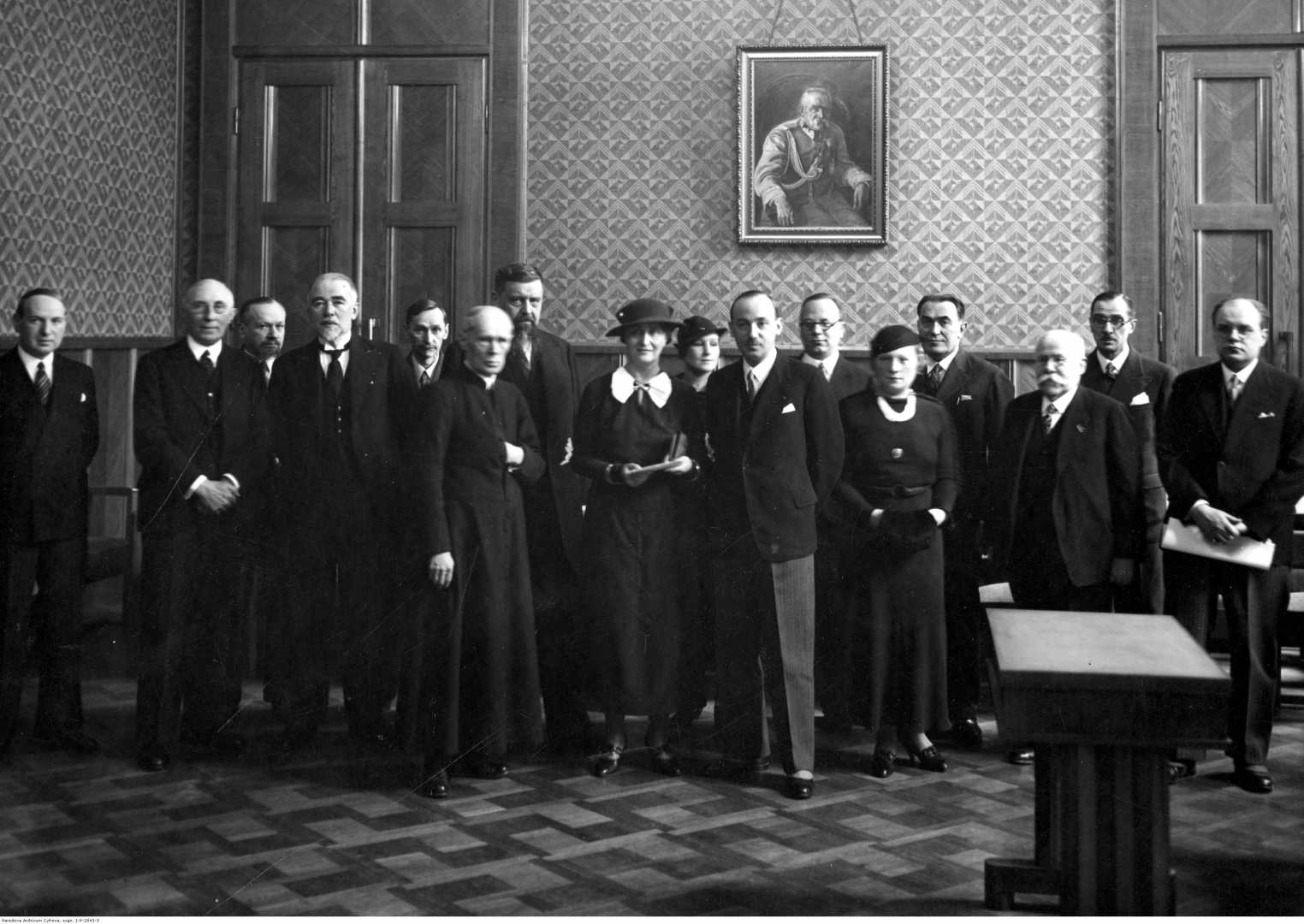 Widoczni m.in.: Kazimiera Iłłakowiczówna (5. z lewej), minister Wacław Jędrzejewicz (6. z lewej), profesor Józef Ujejski (4. z lewej), Wacław Sieroszewski (3. z prawej), Leopold Staff (3. z lewej), Leon Pomirowski (1. z prawej), Tadeusz Żeleński (4. z prawej), wiceminister Konstanty Chyliński (7. z lewej), ks. wiceminister Bronisław Żongołłowicz (5. z lewej w sutannie). Na ścianie wisi portret marszałka Józefa Piłsudskiego.