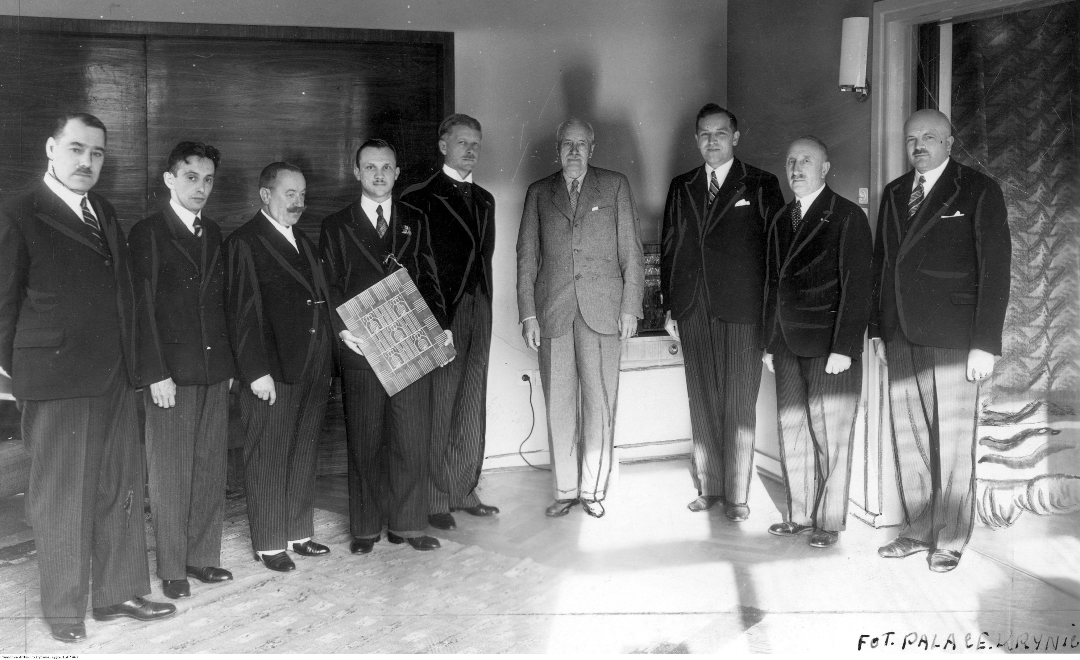Prezydent RP Ignacy Mościcki (czwarty z prawej) wśród uczestników uroczystości . Widoczni m.in.: wojewoda krakowski Michał Gnoiński (piąty z lewej), starosta nowosądecki Maciej Łach (trzeci z prawej), burmistrz Krynicy Michał Zakrzewski (czwarty z lewej), dyrektor Zakładu Zdrojowego w Krynicy Leon Nowotarski (drugi z prawej).