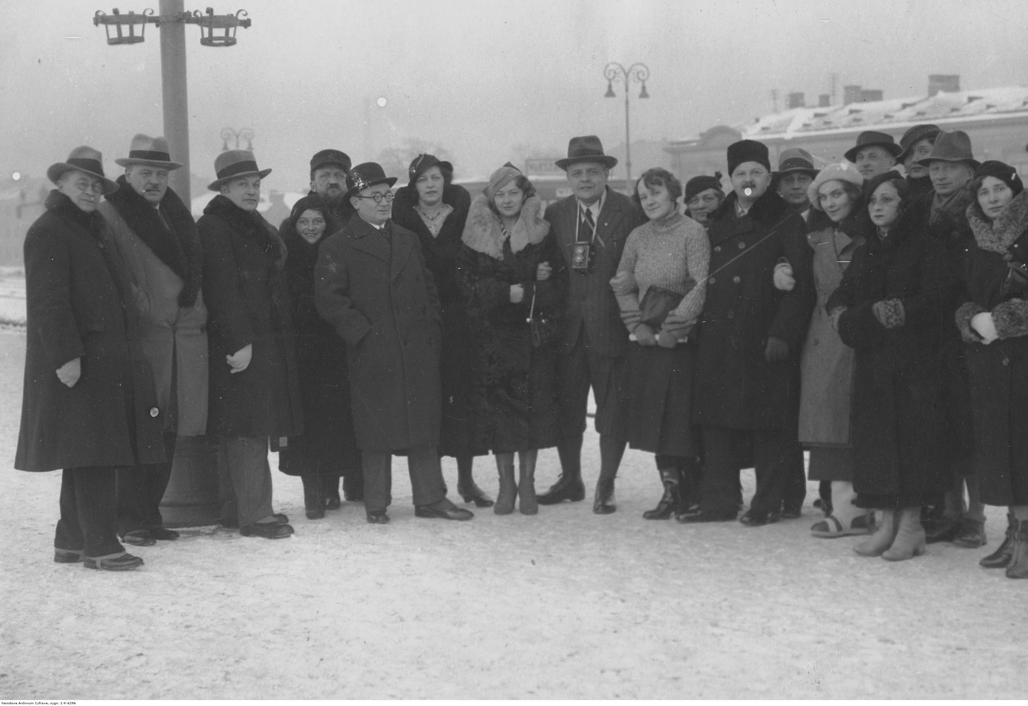 Uczestnicy wycieczki na warszawskim dworcu kolejowym. Wśród artystów widoczny m.in. pisarz Melchior Wańkowicz (w środku z aparatem fotograficznym na szyi).