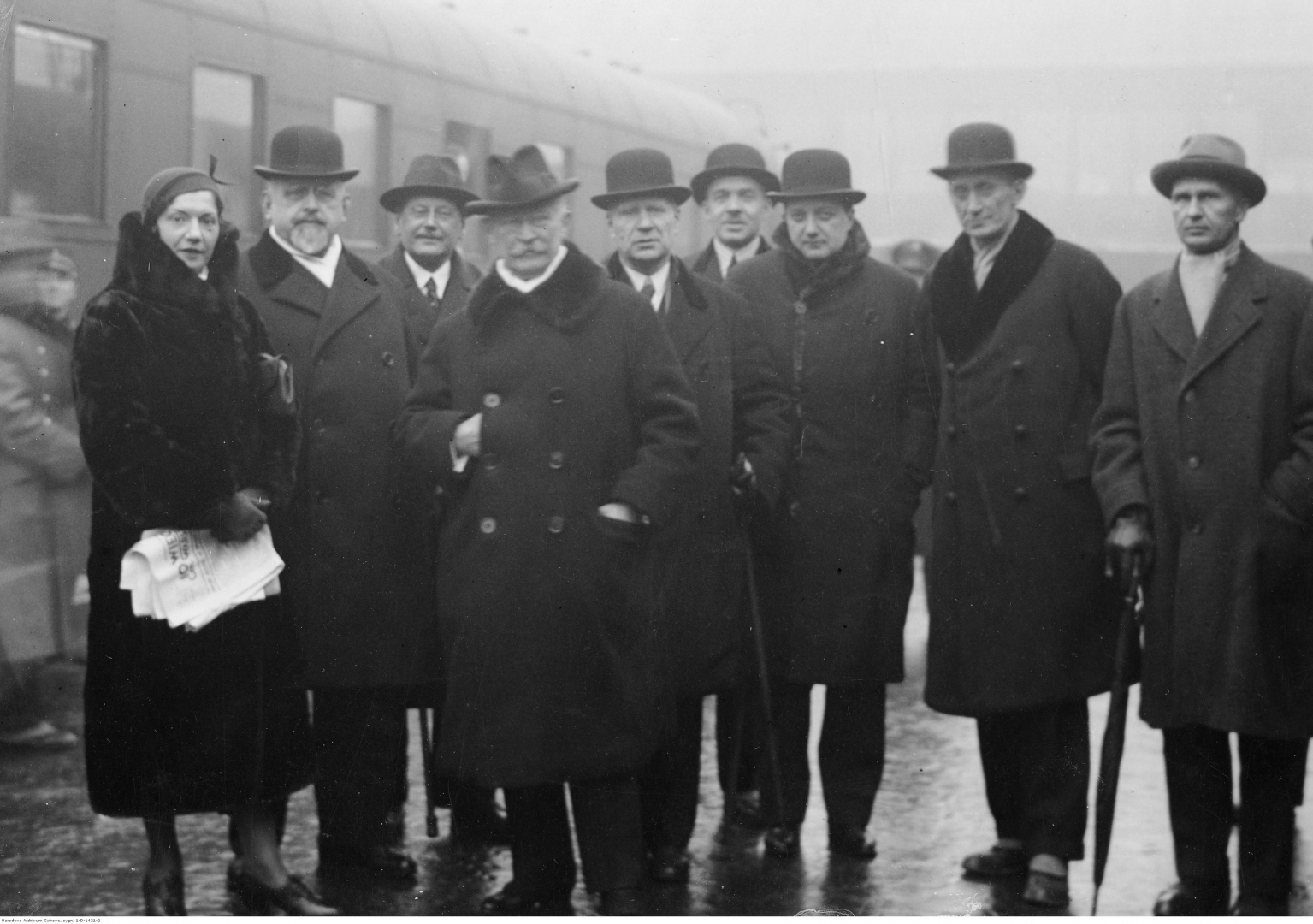 Ambasador Polski w Stanach Zjednoczonych Stanisław Patek (czwarty z lewej) w otoczeniu żegnających go osób na peronie dworca. Widoczni m.in.: kierownik Referatu Ogólnego Kancelarii Cywilnej Prezydenta RP Michał Mościcki (szósty z lewej), dyrektor Wydziału Zachodniego MSZ Józef Lipski (trzeci z prawej), zastępca dyrektora Wydziału Zachodniego MSZ Włodzimierz Adamkiewicz (piąty z lewej), radca MSZ Wiktor Podoski (pierwszy z prawej), senator Jerzy Iwanowski (trzeci z lewej), prezes Polsko-Amerykańskiej Izby Handlowej Leopold Kotnowski (drugi z lewej) oraz korespondentka pism amerykańskich pani Chrzanowska.