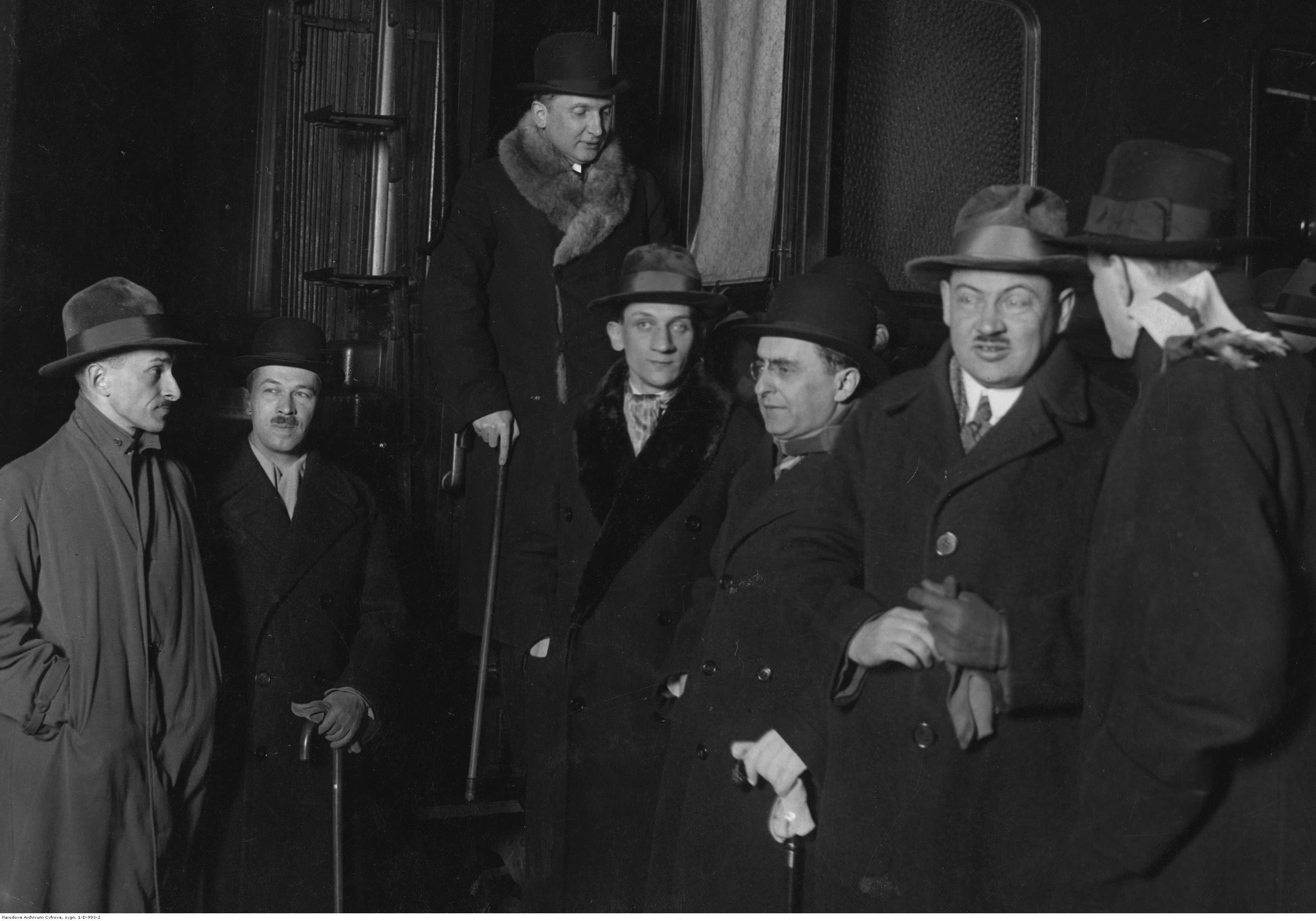 Członkowie delegacji na peronie dworca. Widoczny m.in.: minister spraw zagranicznych August Zaleski (na stopniach wagonu), dyrektor Gabinetu Ministra Spraw Zagranicznych Marian Szumlakowski (drugi z lewej), dyrektor Departamentu Polityczno-Ekonomicznego MSZ Tadeusz Jackowski (piąty z lewej), naczelnik Wydziału Wschodniego w Departamencie Polityczno-Ekonomicznym MSZ Tadeusz Hołówko (szósty z lewej) oraz naczelnik Wydziału Ustrojów Międzynarodowych w Departamencie Polityczno-Ekonomicznym MSZ Adam Tarnowski.