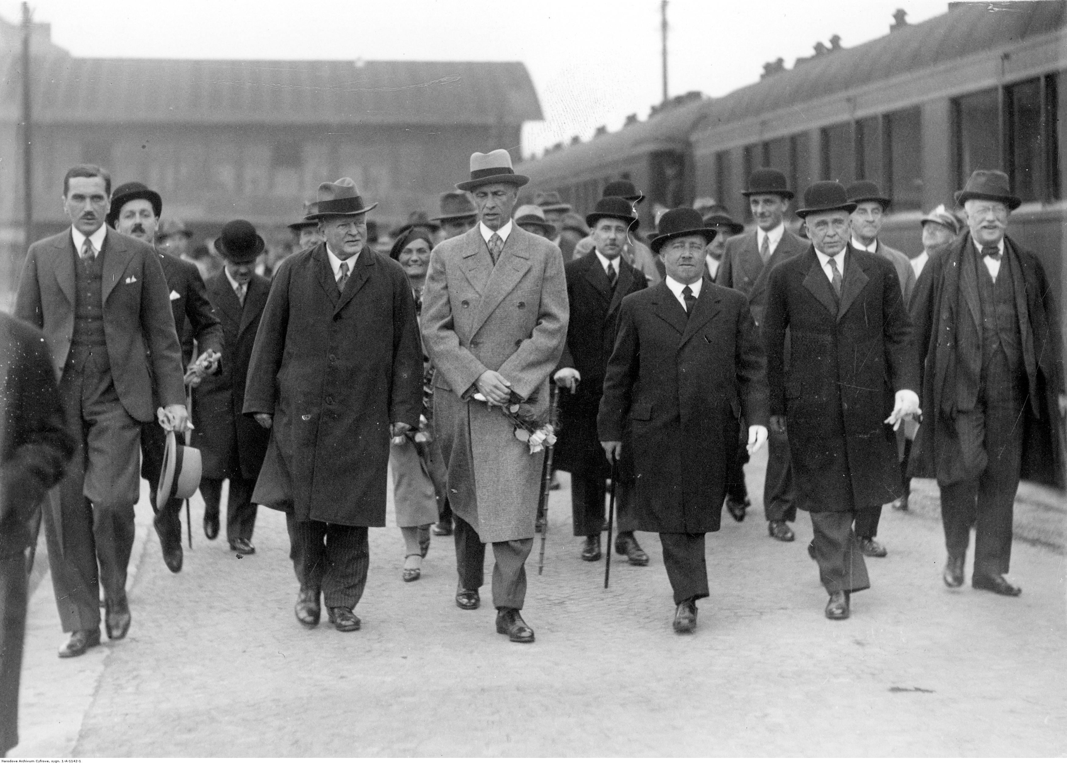Pożegnanie na dworcu Głównym w Warszawie. Poza marszałkiem senatu Władysławem Raczkiewiczem (I rząd czwarty z prawej), widoczni są m.in. prezes Najwyższej Izby Kontroli Jakub Krzemieński, senatorowie Julian Szymański, Antoni Bogucki, Leon Łubieński, sekretarz osobisty marszałka senatu Aleksander Mohl, dyrektor Biura Senatu Adam Piasecki.