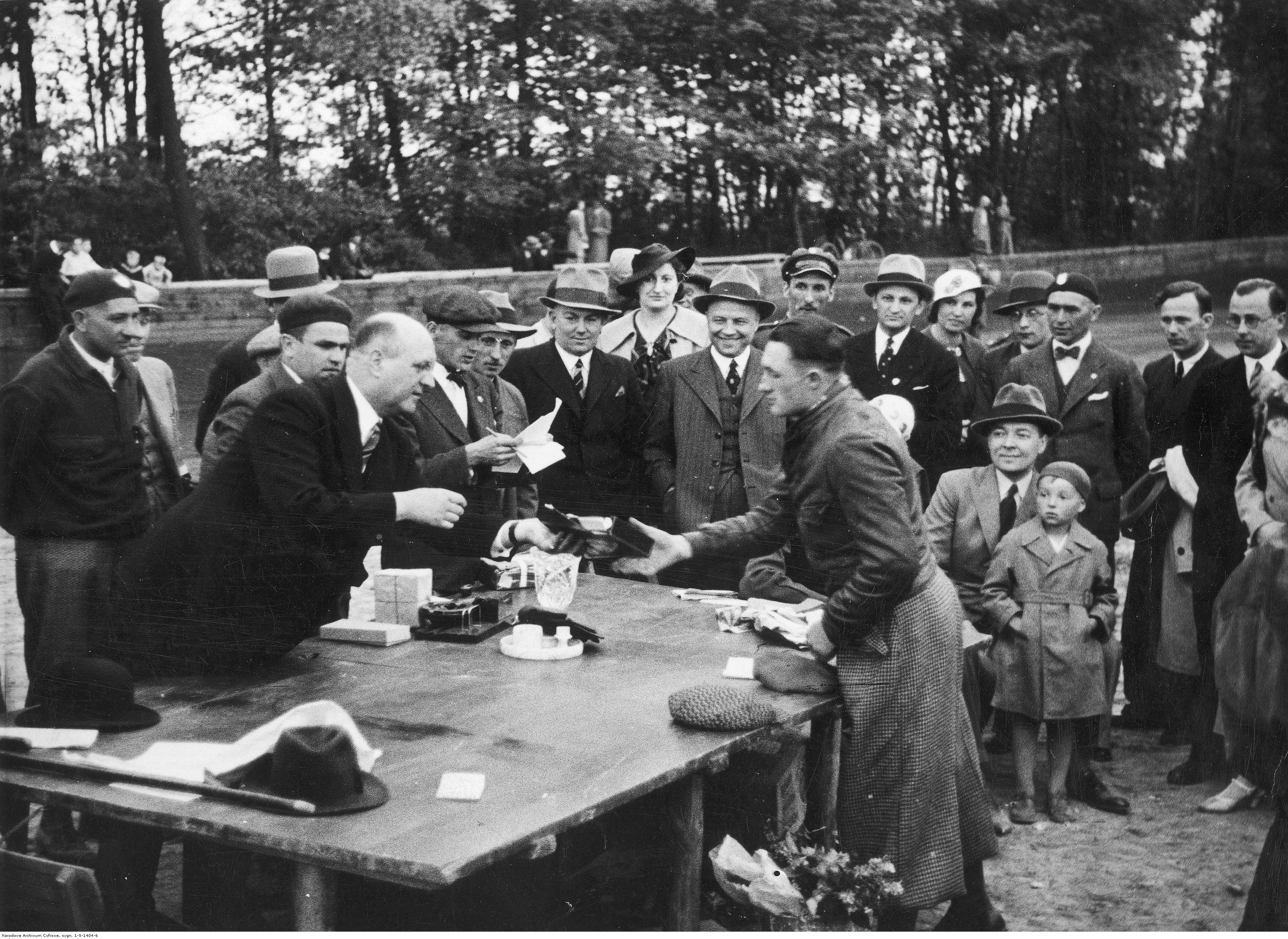 Prezydent miasta Chorzowa Karol Grzesik wręcza nagrodę honorową Janowi Batheltowi za zdobycie pierwszego miejsca w wyścigu w kategorii motocykli o pojemności 500 centymetrów sześciennych.