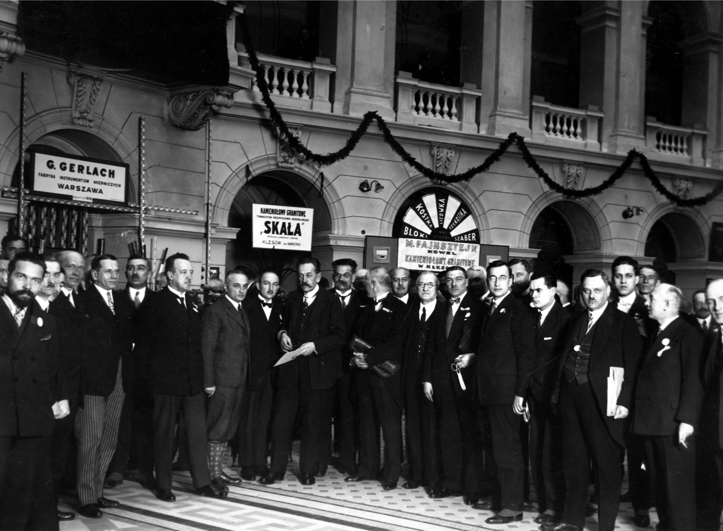 Minister Jędrzej Moraczewski (3. z lewej w I rzędzie) w otoczeniu m.in. prezydenta Warszawy Zygmunta Słomińskiego (6. z lewej w I rzędzie) podczas wystawy.  Fotografia z lat 1925-1929 ze zbiorów Narodowego Archiwum Cyfrowego