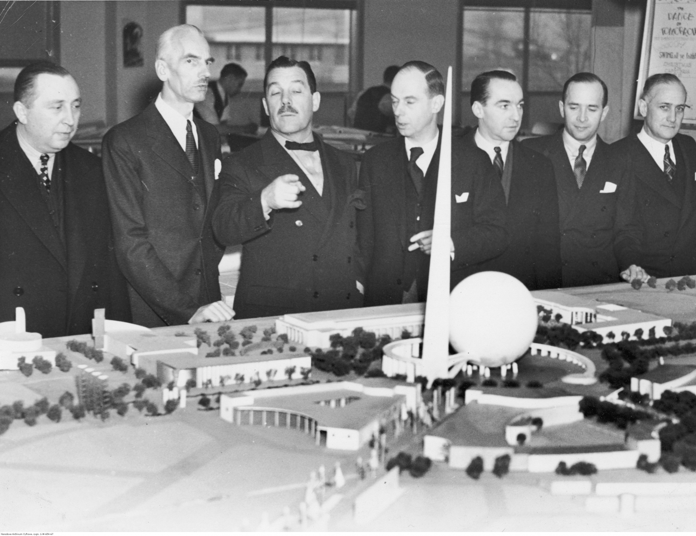 Komisarz Wystawy Światowej w Nowym Jorku Grover A. Whalen (3. z lewej) prezentuje członkom delegacji polskiej makietę terenów wystawowych, znajdującą się w sali komisji projektów, przedstawiającą rozmieszczenie poszczególnych pawilonów. Widoczni także m.in.: konsul generalny RP w Nowym Jorku Sylwester Gruszka (1. z lewej), charge d`affaires Witold Wańkowicz (2. z lewej), komisarz polskiej ekspozycji na Wystawie Światowej w Nowym Jorku prof. Stefan Ropp (4. z lewej), książę Janusz Iliński (3. z prawej), konsul Polski w Nowym Yorku Roman Kwiecień (2. z prawej).