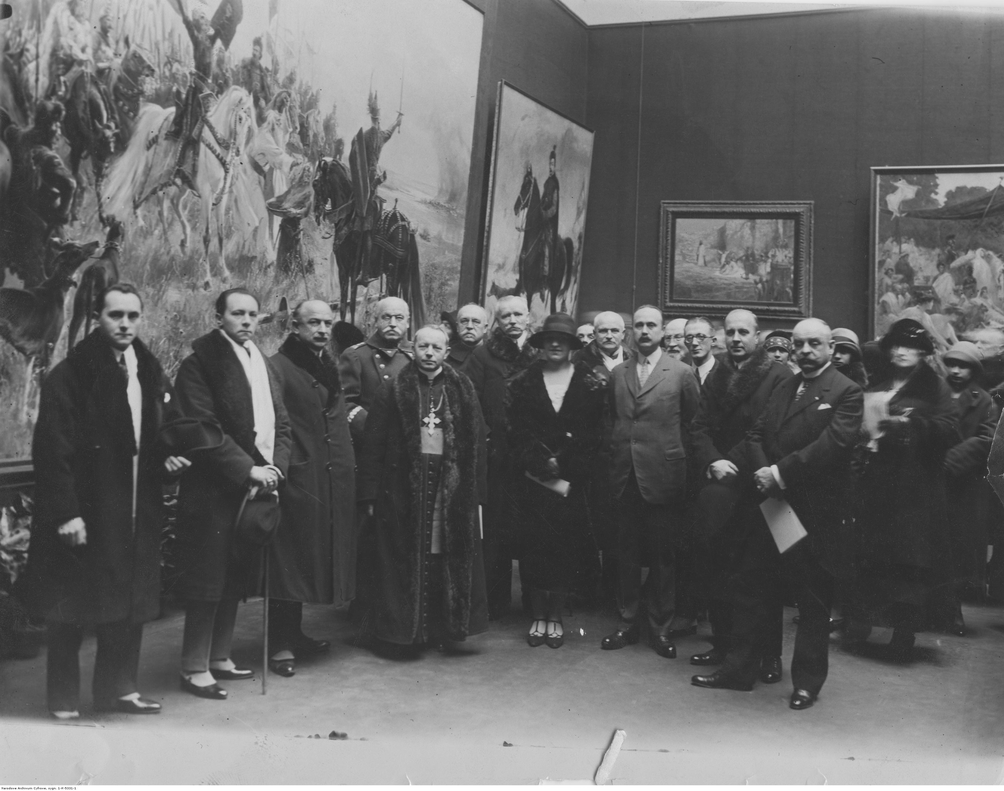 Uczestnicy otwarcia wystawy. Widoczni m.in. artysta malarz Adam Styka (1. z lewej), artysta malarz Tadeusz Styka (2. z lewej), generał Jan Jacyna (4. z lewej), biskup Adolf Szelążek, poseł nadzwyczajny i minister pełnomocny Stanów Zjednoczonych w Polsce John Stetson, poseł nadzwyczajny i minister pełnomocny Czechosłowacji w Polsce Robert Flieder, prezes Towarzystwa Zachęty Sztuk Pięknych Stanisław Brzeziński (I rząd z prawej), francuski generał Edmond Dupont.