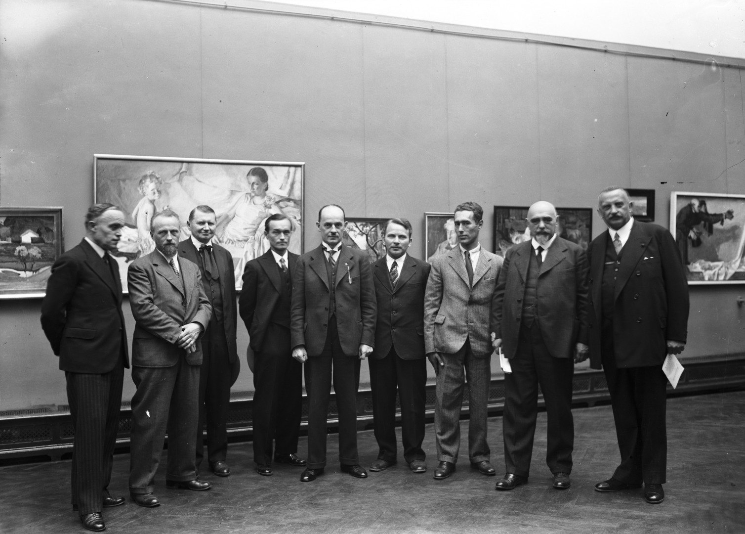 Uczestnicy otwarcia wystawy. Widoczni m.in. sekretarz Towarzystwa Przyjaciół Sztuk Pięknych w Krakowie Artur Schroeder (1. z lewej), rzeźbiarz Stanisław Popławski (2. z lewej), wiceprezydent Krakowa Witold Ostrowski (2. z prawej), wiceprezydent Krakowa Stanisław Klimecki (5. z lewej), artysta malarz Adam Bunsch (4. z lewej), artysta malarz Soter Jaxa-Małachowski.