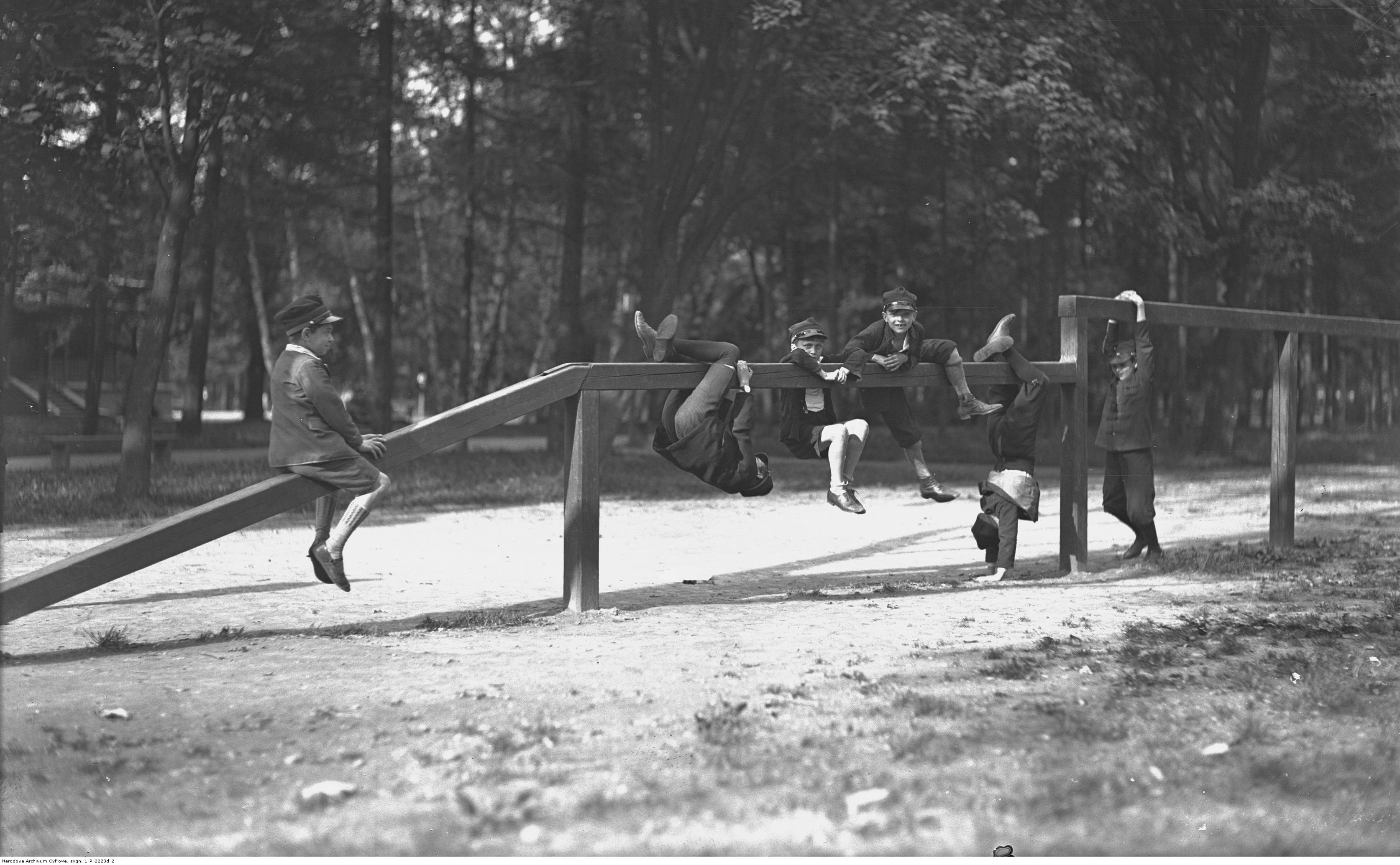 Chłopcy podczas zabawy w parku im. Henryka Jordana.