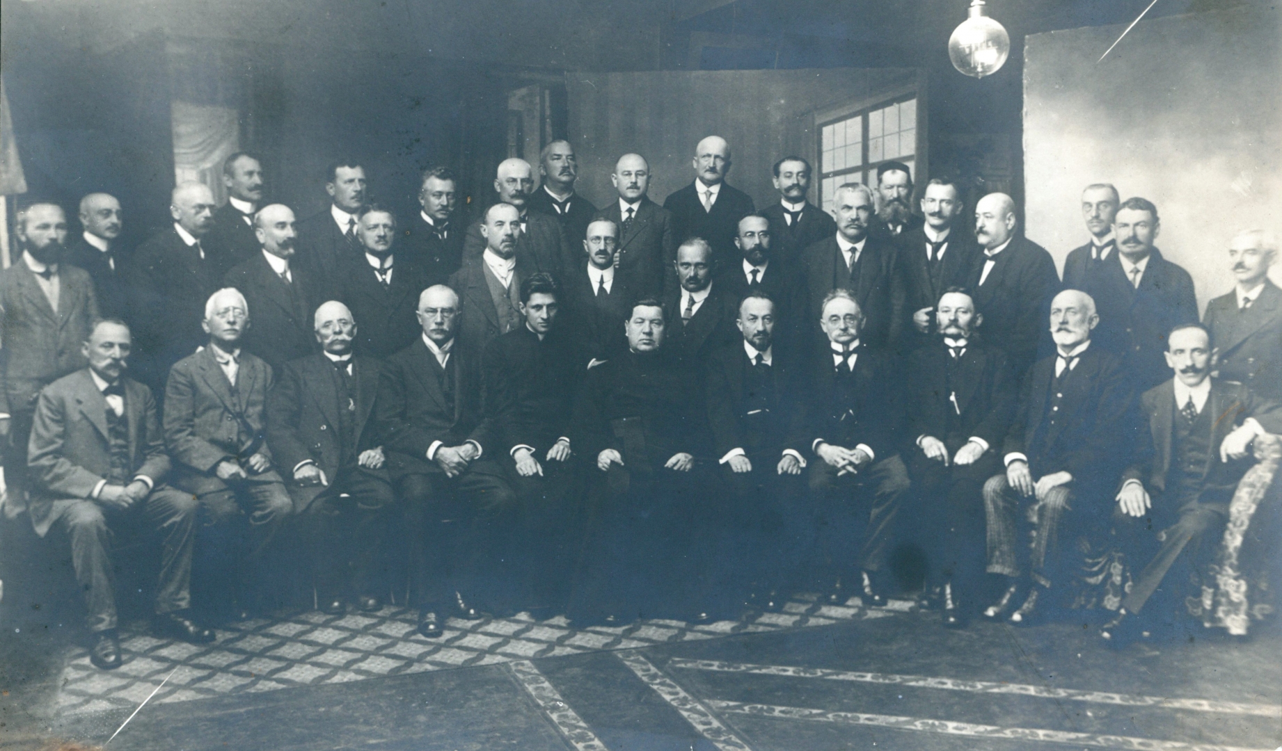 Siedzą od lewej: Szymon Feller, Konstanty Pańkowski, Józef Białynia Chołodecki, Jan Matijów, ksiądz Mikołaj Szczepaniuk, ksiądz Stanisław Sopuch, Adolf Beck, Jakub Izaak Diamand, Walery Włodzimirski, Józef Schirmer, Samuel Pordes. Stoją w pierwszym rzędzie od lewej: Hilarion Święcicki, Maurycy Oberländer, Roman Lewicki-Rogala, Salo Goldfrucht, Spirydion Bańkowski, Stepan Fedak, Jakub Reich, Kazimierz Józef Lubieniecki, Oswald Zion, Roman Sosnowski-Nałęcz, Zygmunt Hahn, Michał Toepfer, Włodzimierz Baczyński, Mojżesz Sekler, Izaak Schor. Stoją w drugim rzędzie od lewej: Juliusz Kühner, Adam Kauczyński, Emil Habdank Dunikowski, Aleksander Czołowski, Michał Kociuba, Jakub Schreiber, Artur Goldman, Bernard Breitmann, Berl Mischl.