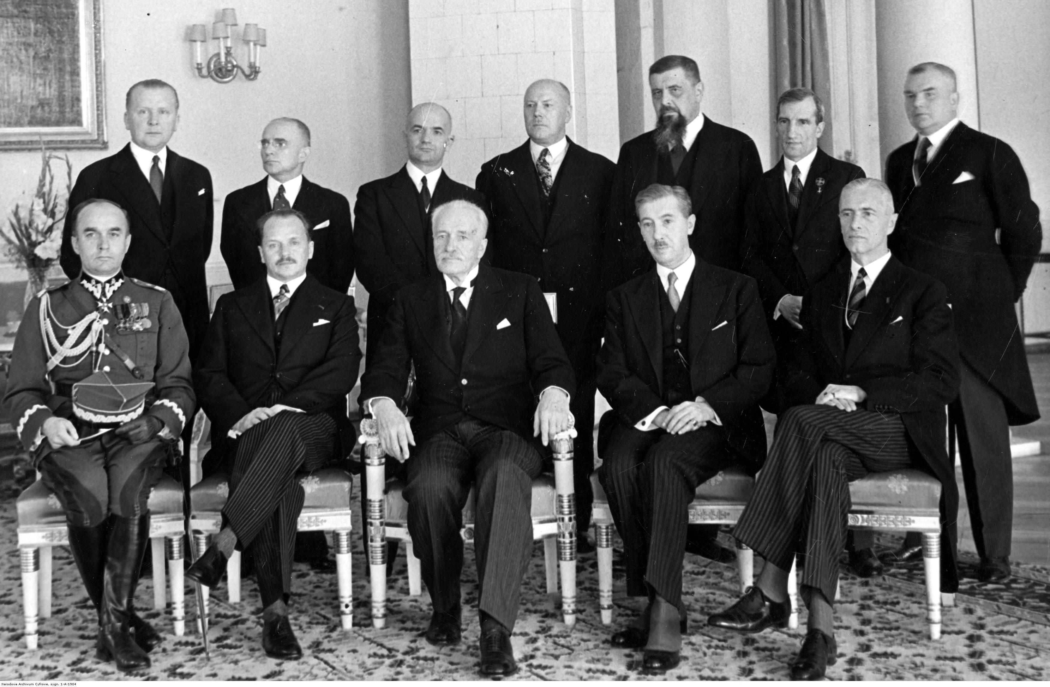 Prezydent RP Ignacy Mościcki wśród członków gabinetu w Salonie Kolumnowym na Zamku Królewskim. Siedzą od lewej: minister spraw wojskowych generał Tadeusz Kasprzycki, premier Marian Zyndram Kościałkowski, prezydent RP Ignacy Mościcki, wicepremier i minister skarbu Eugeniusz Kwiatkowski, minister spraw wewnętrznych Władysław Raczkiewicz. Stoją od lewej: minister poczt i telegrafów Emil Kaliński, minister komunikacji Michał Butkiewicz, minister przemysłu i handlu Roman Górecki, minister opieki społecznej Władysław Jaszczołt, wiceminister wyznań religijnych i oświecenia publicznego Konstanty Chyliński, minister rolnictwa Juliusz Poniatowski, minister sprawiedliwości Czesław Michałowski.