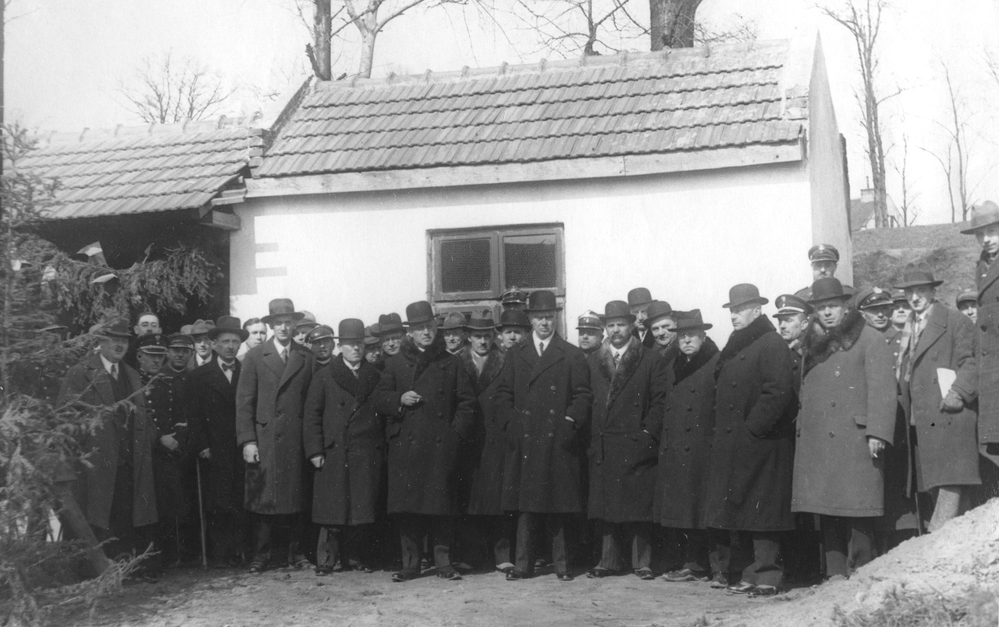 Fotografia grupowa gości. Od lewej widoczni m.in.: prezes zarządu Władysław Kasztelewicz, obwodowy Związku Strzeleckiego J. Wiciński, dyr. Dorawski, dr Kolkiewicz, płk dr Kaplicki, wiceprezydent Krakowa dr Stanisław Klimecki, wojewoda krakowski dr Mikołaj Kwaśniewski, płk Aleksander Wójcicki, prezydent Krakowa płk Władysław Belina-Prażmowski, sekr. Strasik, dr Schneider, płk dr Bolesław Korolewicz, A. Czerwiński.