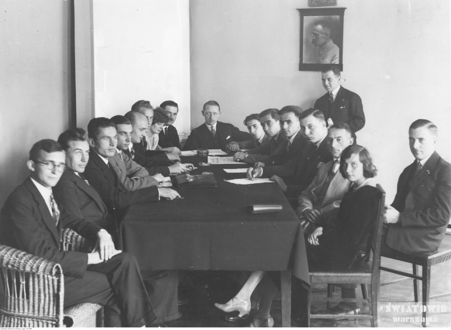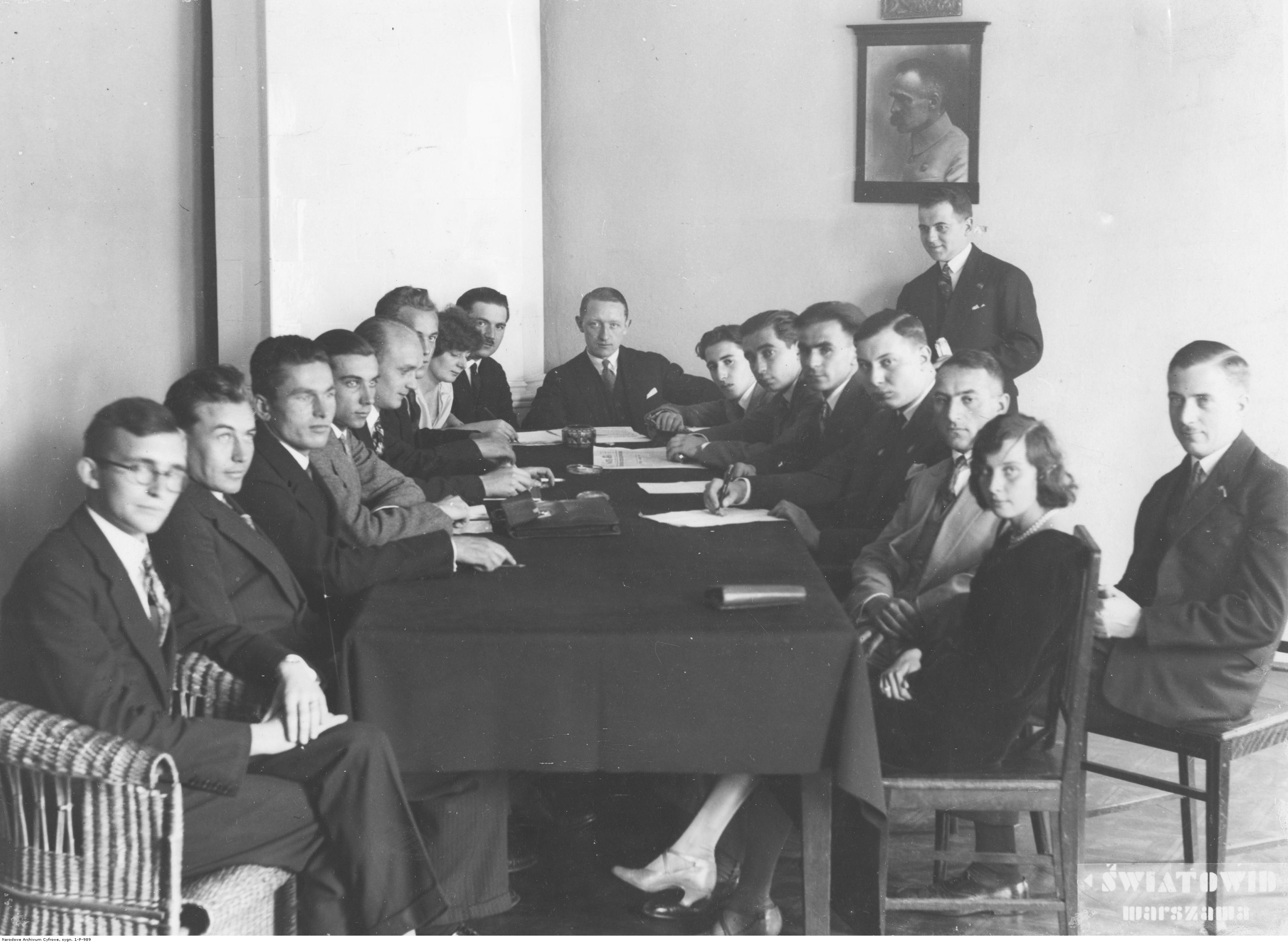 W środku widoczny Jan Grzywaczewski. Z lewej od góry do dołu widoczni: Rakowski, Lipińska, Szeleźniak, Sergialis, Klukowski, Bartoszczyk, Łuczyński i Szulc. Z prawej od góry do dołu widoczni: Pogucki, Ostrowski, Ursus-Siwiłło, Szper, przewodniczący Wydziału Wykonawczego Związku T. Piskorski, Żenczykowski i Piskorska.