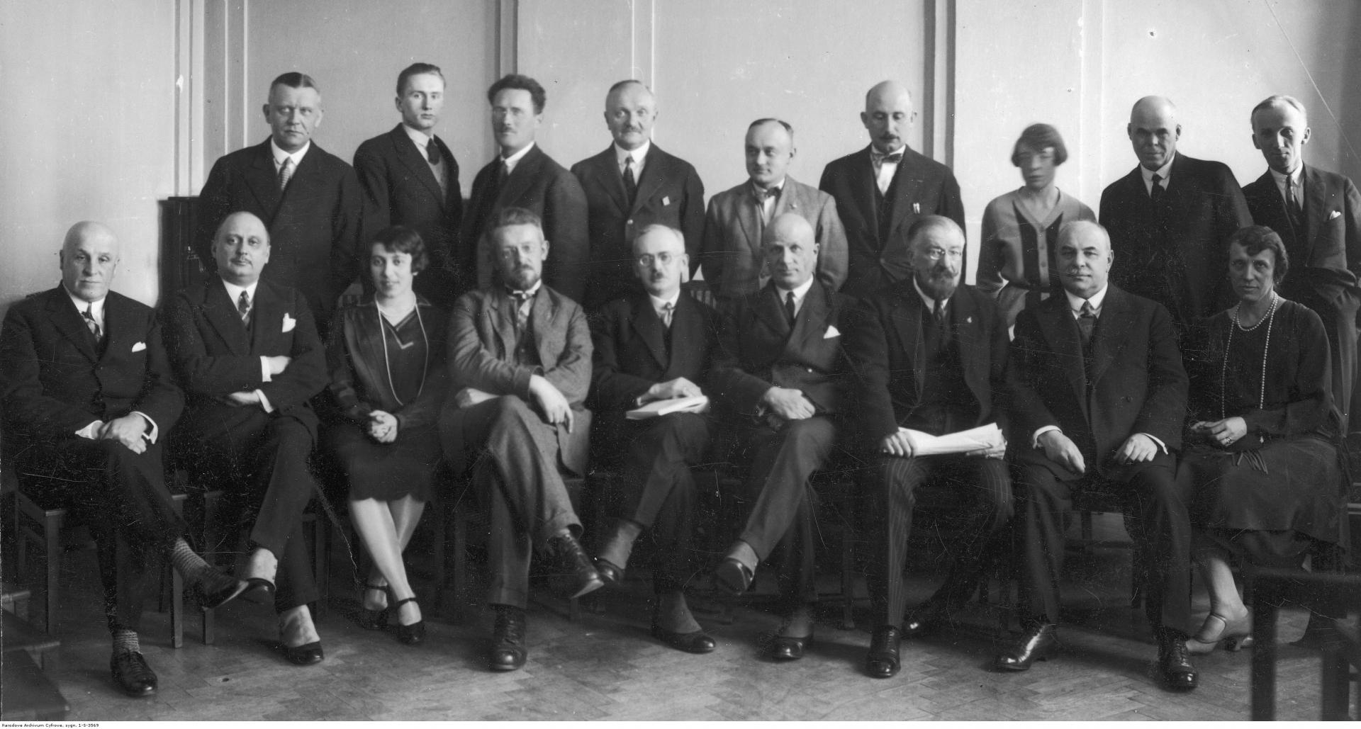 Fotografia grupowa uczestników zjazdu. Siedzą od lewej: przewodniczący Międzyministerialnej Komisji Turystycznej i przewodniczący sekcji turystycznej Automobilklubu Polski inż. Mieczysław Rappe, sekretarz Automobilklubu Polski mecenas Franciszek Sznarbachowski, kierowniczka biura związku Maria Szachówna, referent turystyki w Ministerstwie Robót Publicznych doktor Mieczysław Orłowicz, wiceprezes Polskiego Towarzystwa Krajoznawczego i wiceprezes Związku Polskich Towarzystw Turystycznych Aleksander Patkowski, prezes Związku Polskich Towarzystw Turystycznych Stanisław Osiecki, wiceprezes Związku Polskich Towarzystw Turystycznych Karol Raczyński, inż. Ryszard Minchejmer, członkini komisji rewizyjnej Irena Koliskowa. Stoją delegaci innych towarzystw turystycznych i krajoznawczych.