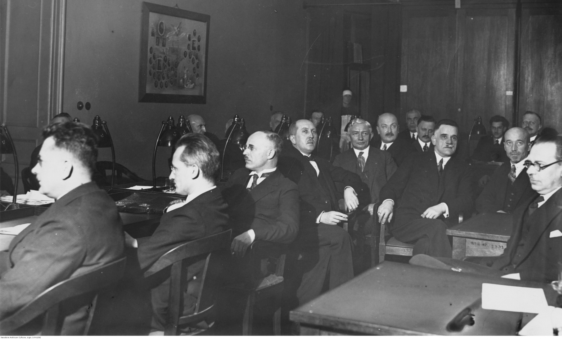 Widoczni m.in. naczelnik Wydziału Szkół Powszechnych Marian Reiter (3. z prawej) i dyrektor Departamentu Szkół Powszechnych Władysław Żłobicki (5. z prawej).