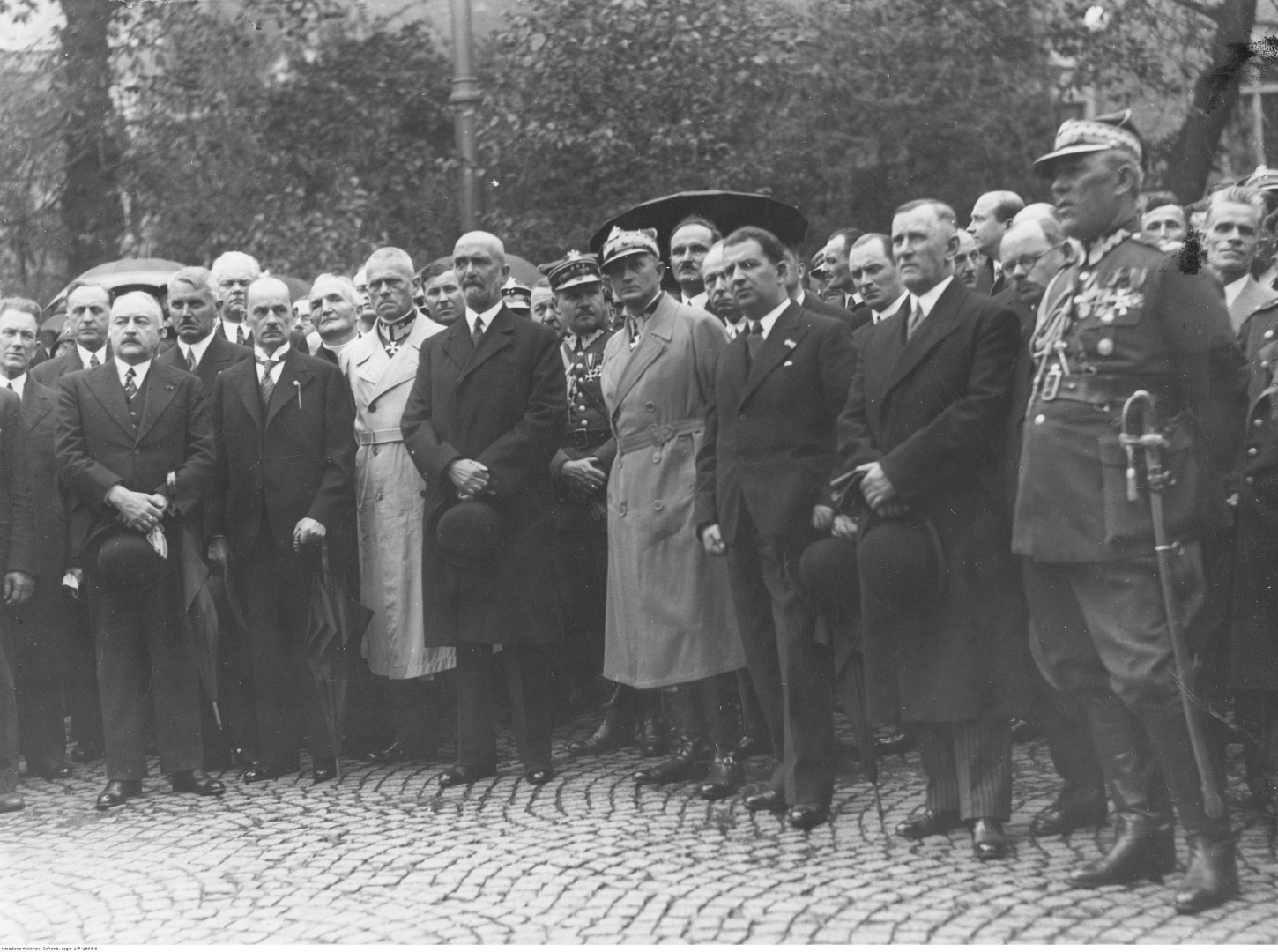 Odsłonięcie tablicy pamiątkowej wmurowanej na rogu ul. Piłsudskiego i Straszewskiego. Stoją od lewej w pierwszym rzędzie: prof. Kazimierz Władysław Kumaniecki (trzyma melonik, parasol zawieszony na lewym ręku), wiceprezydent Krakowa Stanisław Klimecki (podpiera się parasolem), prezes Związku Legionistów Polskich Walery Sławek (trzyma melonik), gen. bryg. Aleksander Narbut-Łuczyński, wicewojewoda krakowski Piotr Małaszyński, NN, dowódca 6 DP gen. Bernard Mond. Na drugim planie widoczni m.in.: poseł Bolesław Pochmarski (na lewo za prof. Kumanieckim), gen. dyw. Stanisław Haller (w jasnym płaszczu na lewo za W. Sławkiem), prepozyt kościoła św. Anny w Krakowie ks. Jan Masny (na lewo za gen. Hallerem), pułkownik Marian Bolesławicz (na prawo za W. Sławkiem), starosta krakowski Władysław Wnęk (w okularach, na lewo za gen. Mondem).