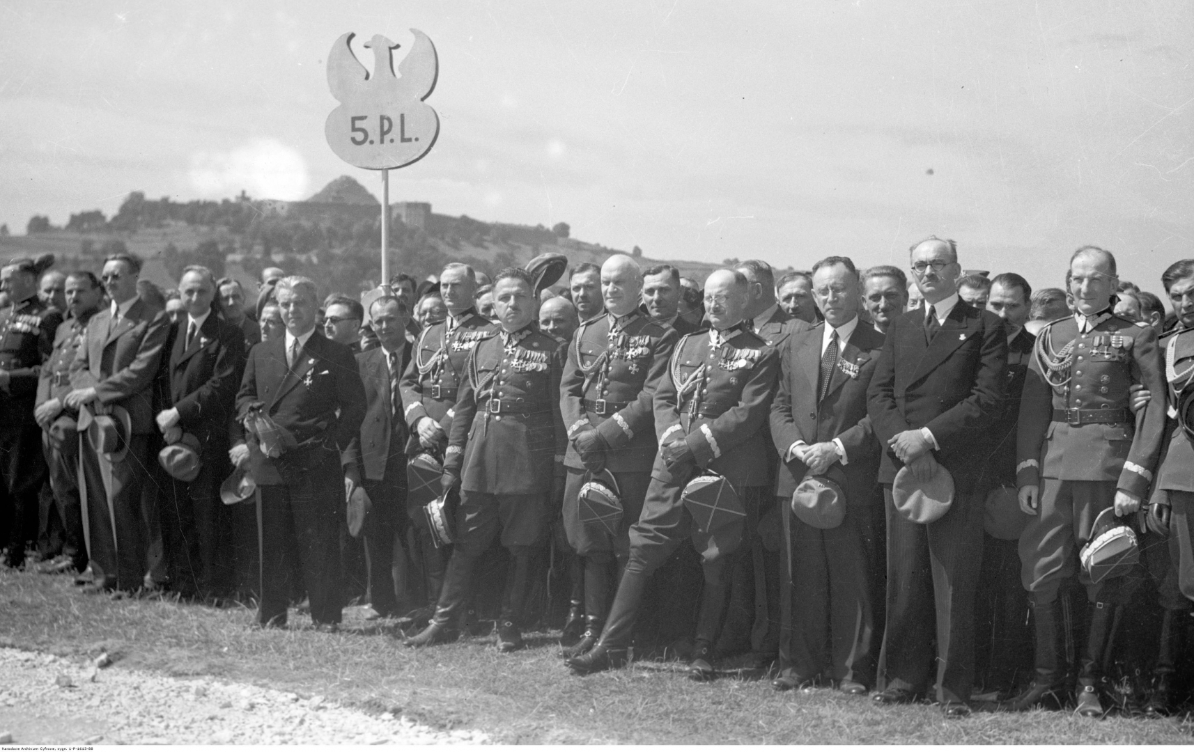 Msza na Błoniach. Legioniści - sektor 5 pułku piechoty legionów. Widoczni m.in.: minister komunikacji prezes Związku Legionistów Polskich Juliusz Ulrych (po lewej na pierwszym planie z ręką w kieszeni), dowódca Okręgu Korpusu V Kraków gen. Aleksander Narbut-Łuczyński (w pierwszym rzędzie siódmy od prawej, częściowo zasłonięty ramieniem Jarnuszkiewicza), inspektor Przysposobienia Wojskowego i Wychowania Fizycznego gen. Czesław Jarnuszkiewicz (w pierwszym rzędzie szósty od prawej), dowódca 28 DP gen. Władysław Bończa-Uzdowski (w pierwszym rzędzie piąty od prawej), dyrektor Państwowego Urzędu Wychowania Fizycznego i Przysposobienia Wojskowego gen. Kazimierz Sawicki (w pierwszym rzędzie czwarty od prawej, w okularach), prezydent Krakowa Mieczysław Kaplicki (w pierwszym rzędzie trzeci od prawej).