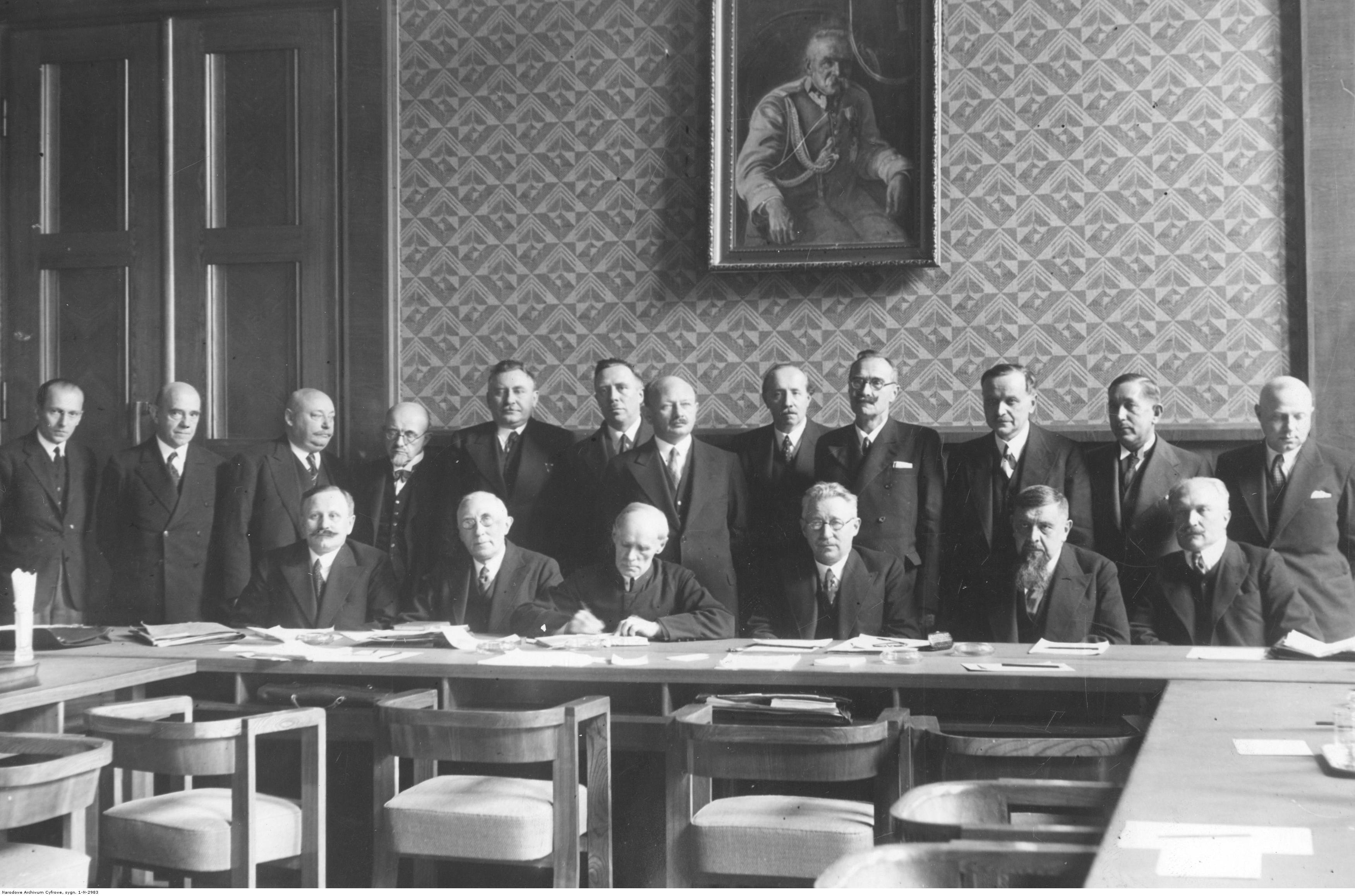 Widoczni m.in. minister wyznań religijnych i oświecenia publicznego Wojciech Świętosławski (siedzi 4. z lewej), wiceminister wyznań religijnych i oświecenia publicznego Bronisław Żongołłowicz (siedzi 3. z lewej), wiceminister wyznań religijnych i oświecenia publicznego Konstanty Chyliński (siedzi 2. z prawej). Na ścianie wisi portret Marszałka Józefa Piłsudskiego.