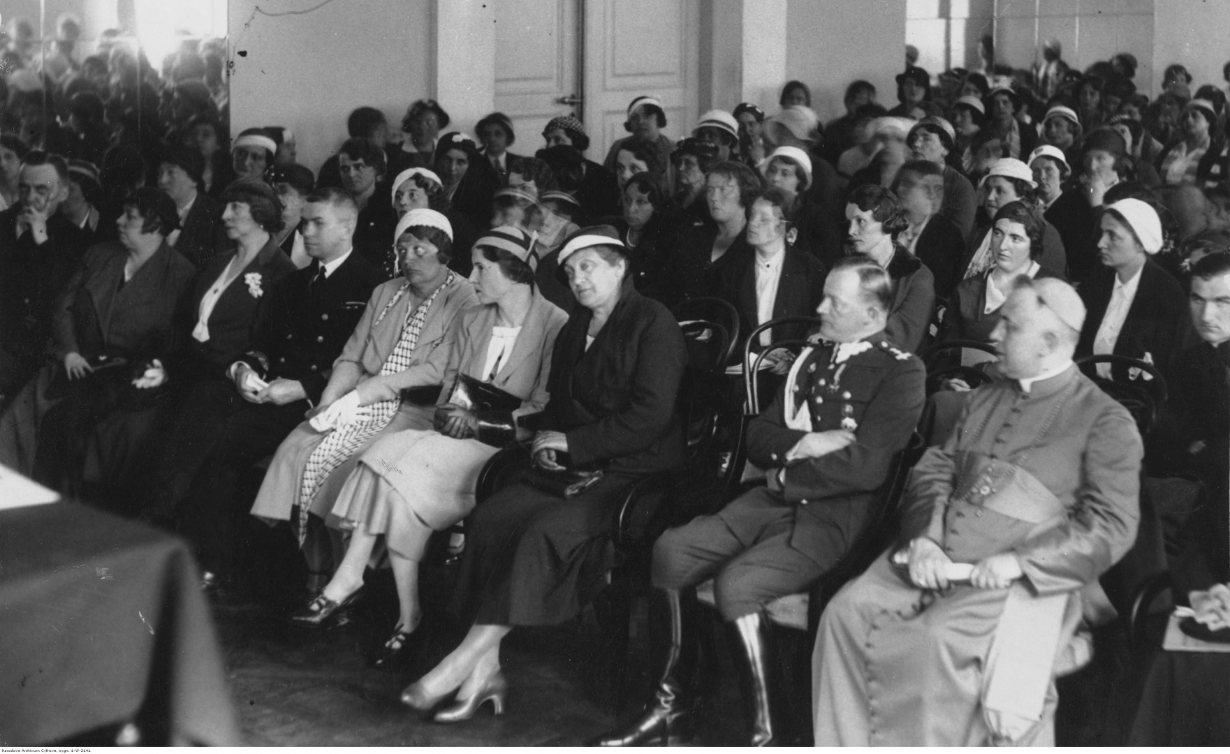 Widok ogólny na salę obrad i uczestników zjazdu. W pierwszym rzędzie widoczni m.in.: Aleksandra Piłsudska (w środku, obok ppłk Sokołowskiego), Jadwiga Beck (z prawej Aleksandry Piłsudskiej), ksiądz biskup Józef Gawlina (1 z prawej), ppłk Adam Sokołowski (2 z prawej).